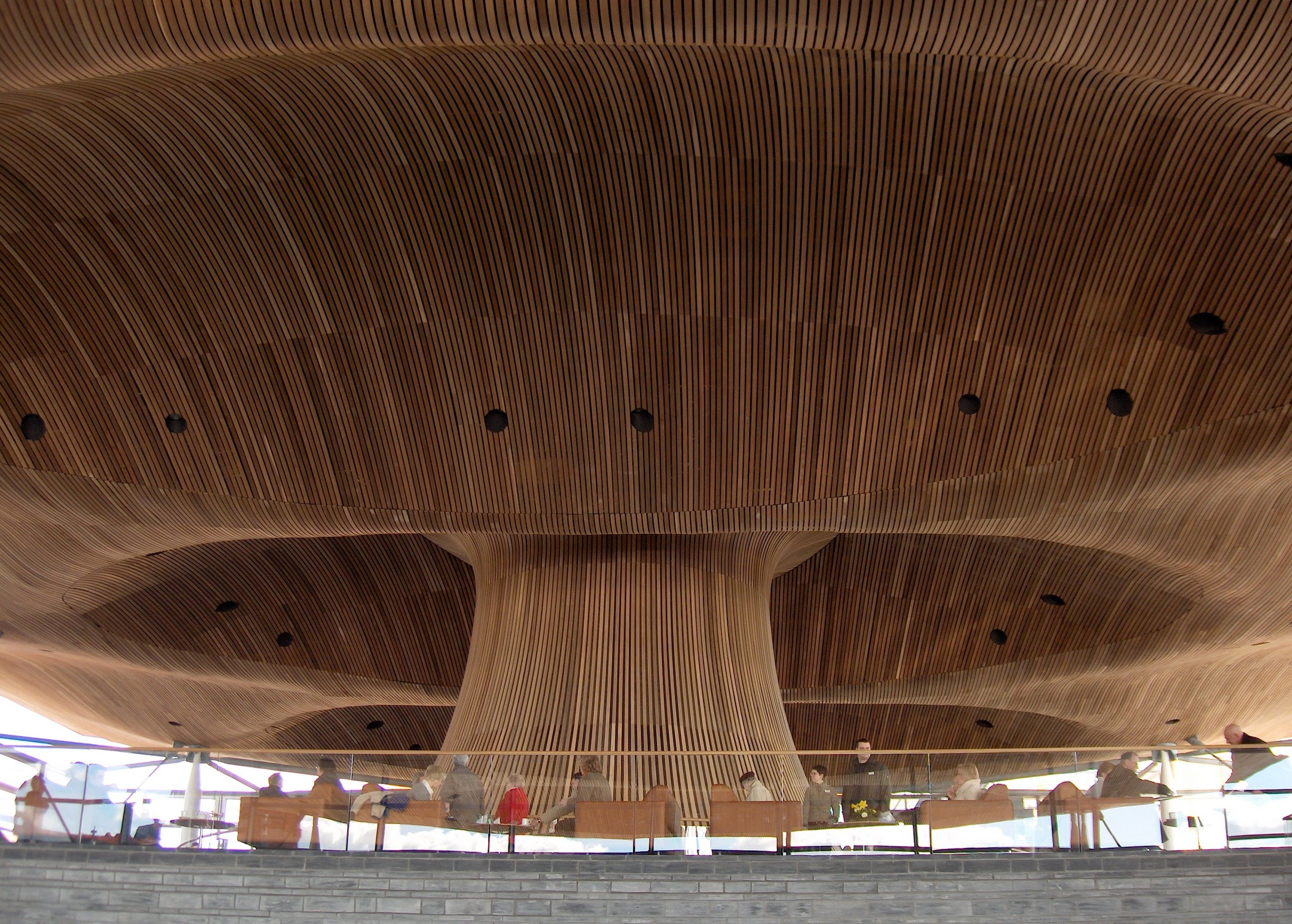 Free image/jpeg, Resolution: 3644x2607, File size: 2.51Mb, people resting under red cedar ceiling and funnel in the Welsh National Assembly building, uk, Wales, cardiff bay picture with tags: cardiff, senedd, building, government, architecture