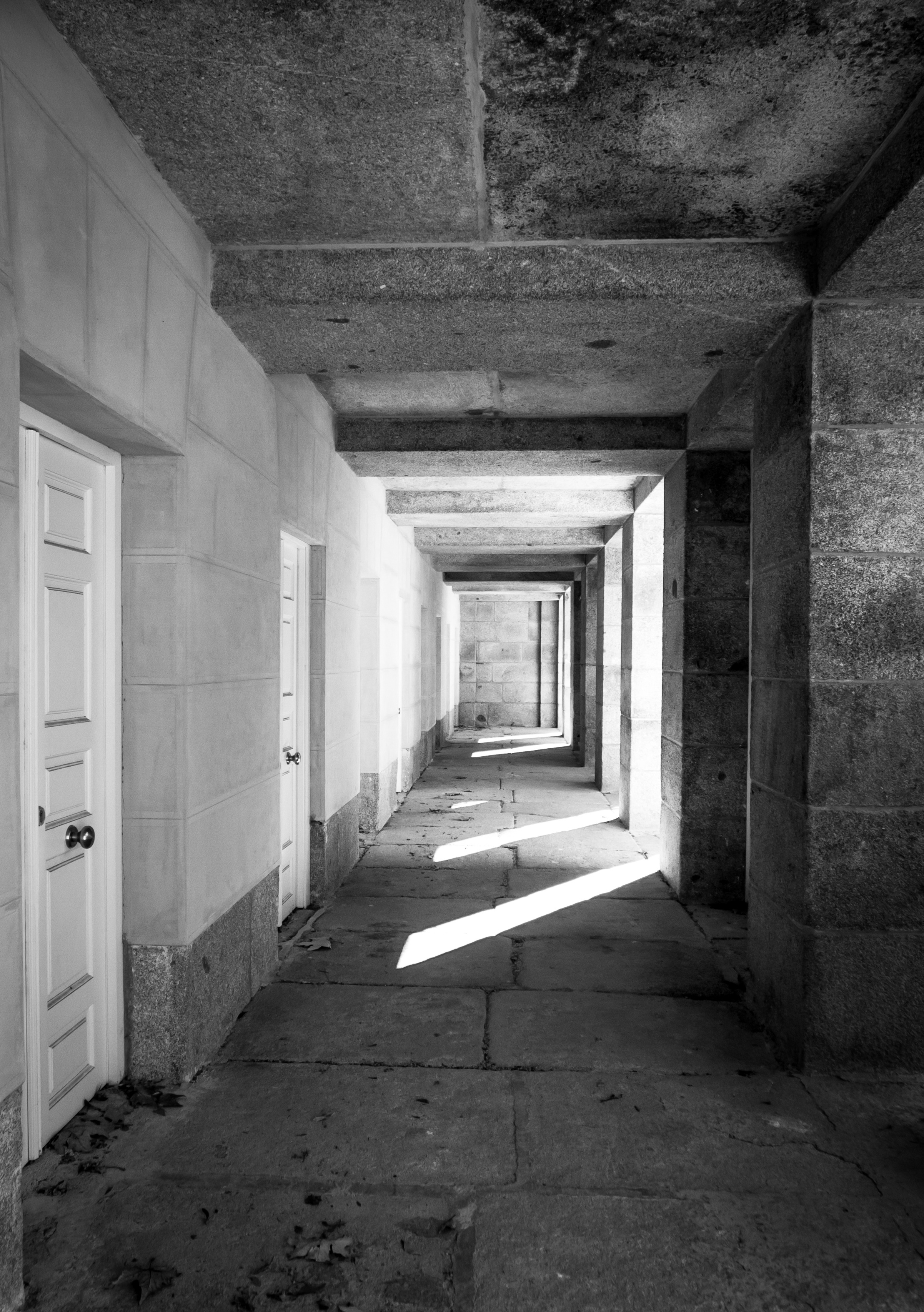 Free image/jpeg, Resolution: 2403x3412, File size: 1.88Mb, black and white image of a passage in a building picture with tags: hall, fear, perspective, doors, black and white, housing