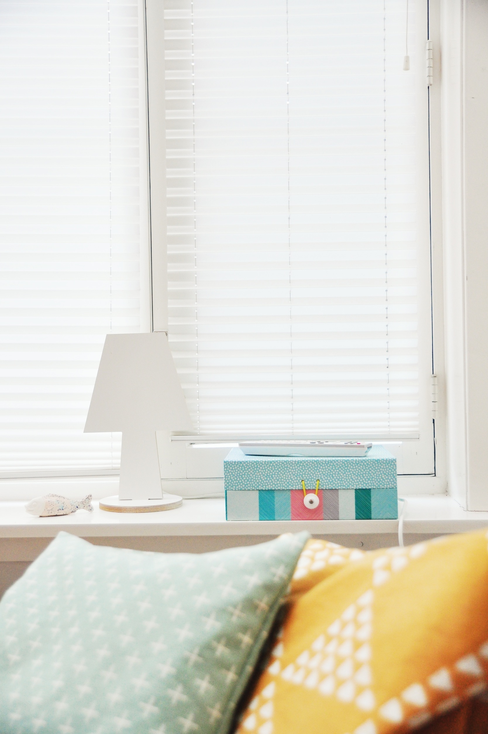 Bedroom interior with pillows, blinds on window, lamp and box on windowsill