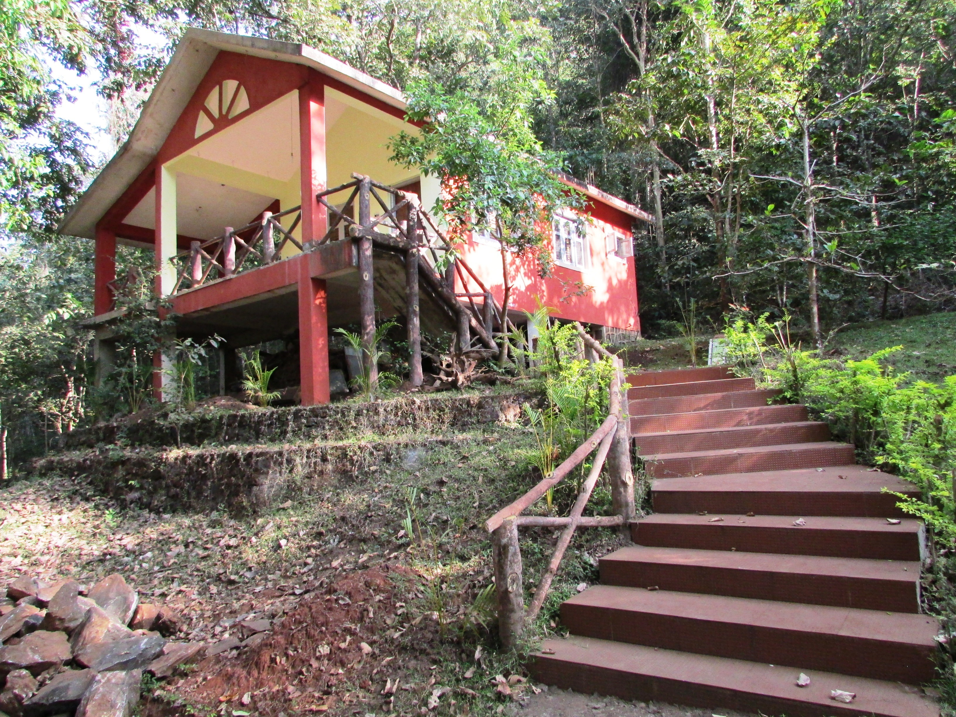 Free image/jpeg, Resolution: 3264x2448, File size: 2.78Mb, red stairs to building at forest, india, dandeli picture with tags: farm house, dandeli, india, architecture, building, city, architecture design