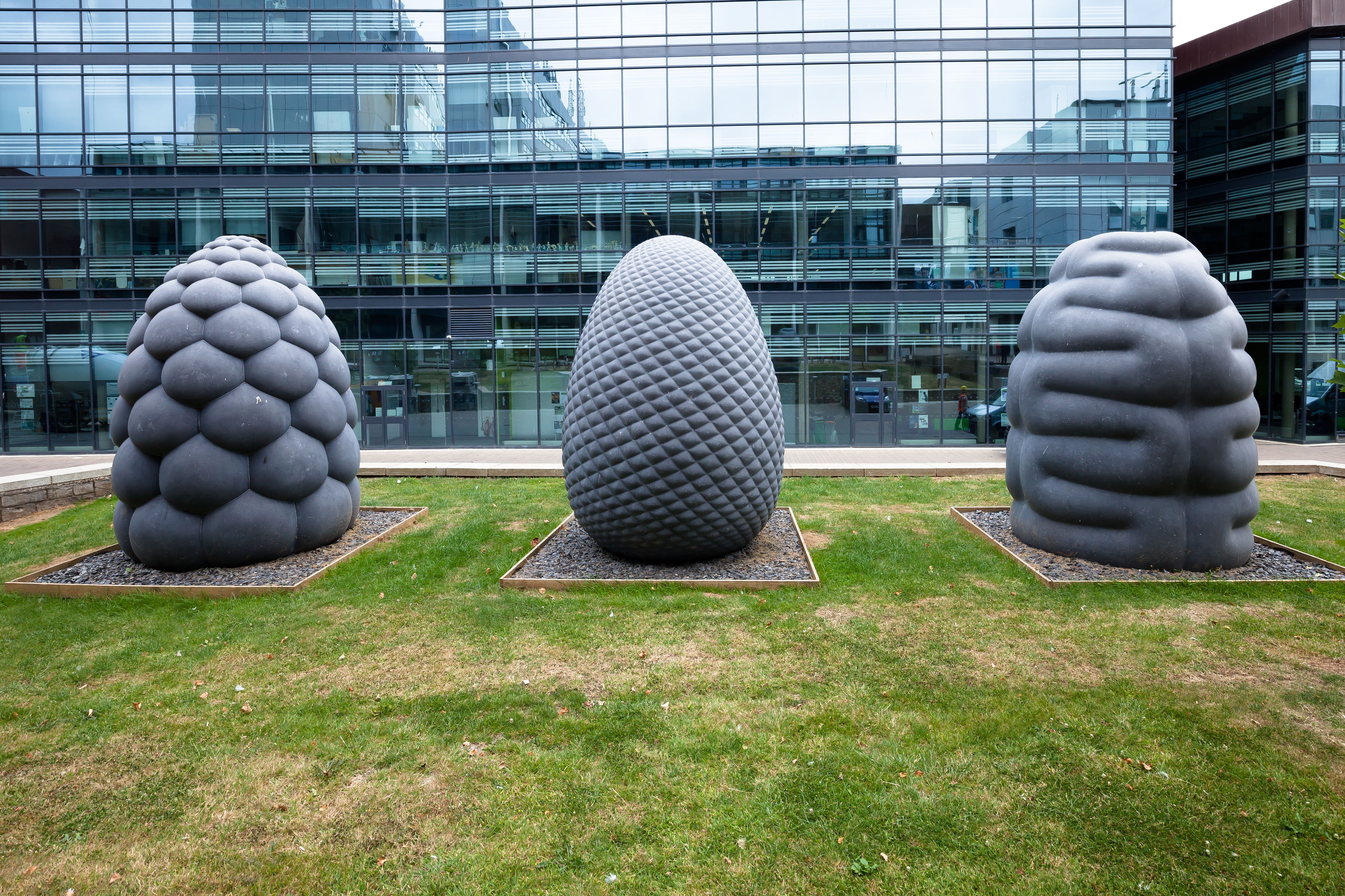 Free image/jpeg, Resolution: 5616x3744, File size: 5.48Mb, Three sculptures by peter Randall-page artist picture with tags: sculpture, stone, architecture, facade, glass, mirroring, peter randall-page, graphic artist