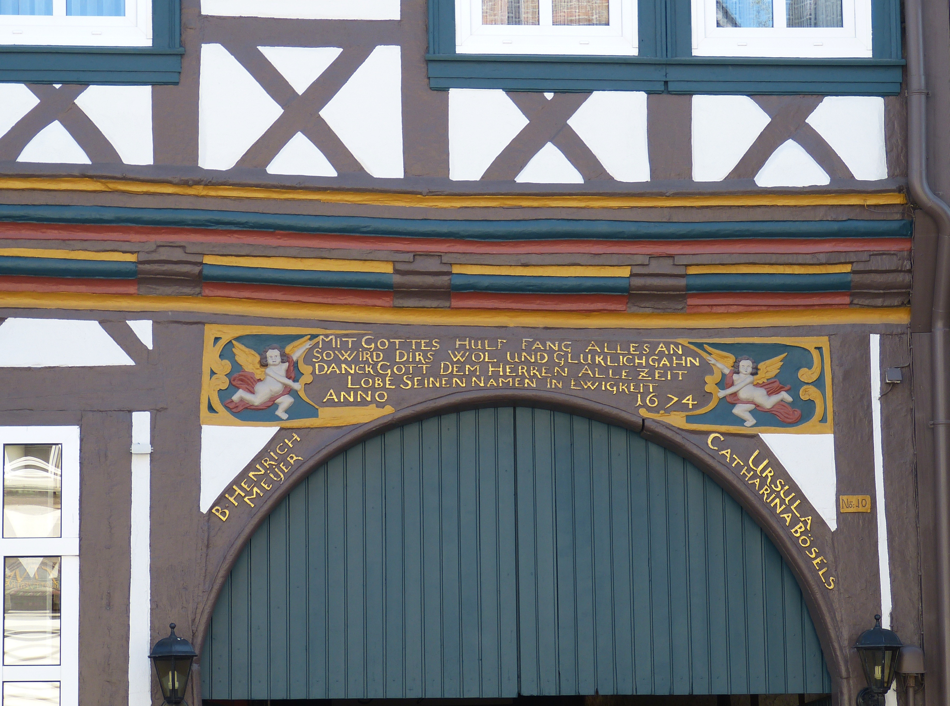 Free image/jpeg, Resolution: 3674x2730, File size: 2.02Mb, shield with angls and golden lettering at top of gates in aged truss house picture with tags: truss, fachwerkhaus, home, old house