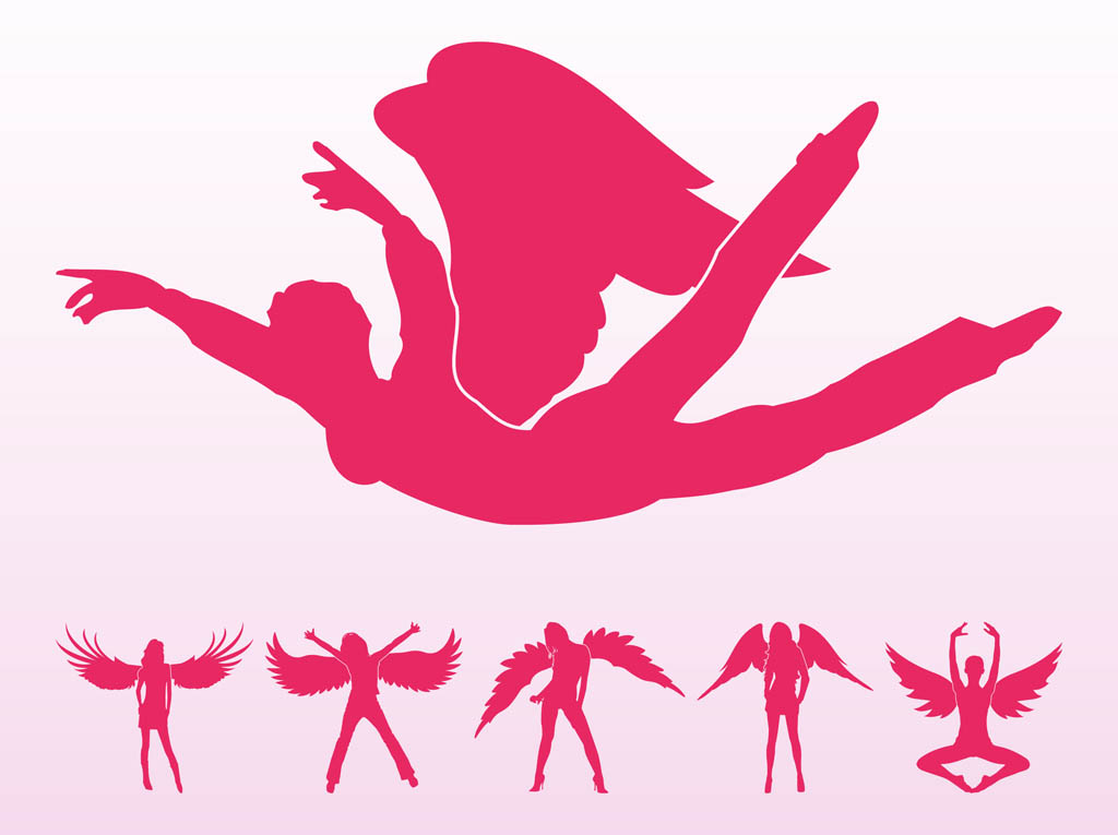 Pink silhouettes of angels in various poses