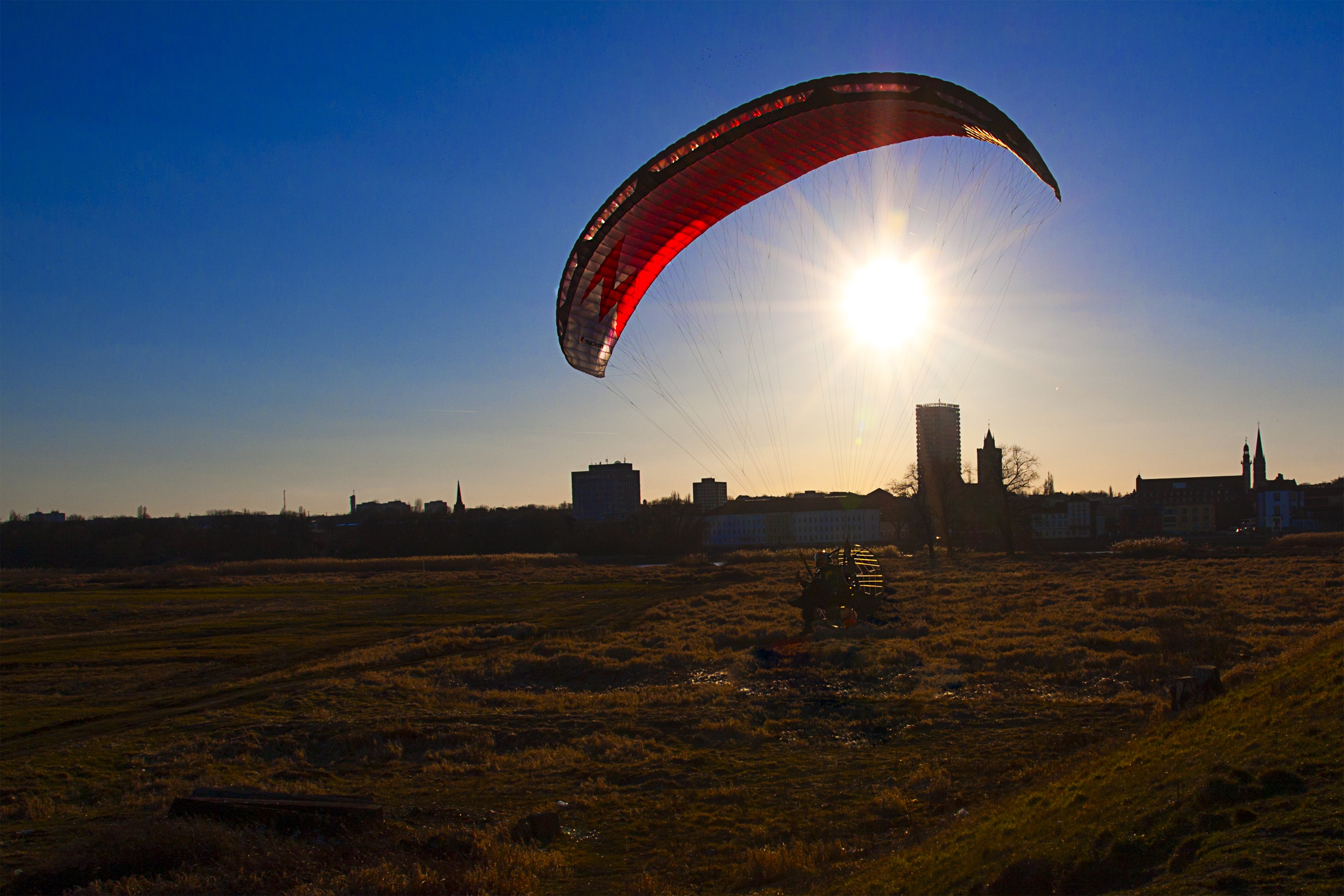 Free image/jpeg, Resolution: 3888x2592, File size: 1.79Mb, person on paraglider at sunset city skyline picture with tags: city, view, hang glider, person, sunset