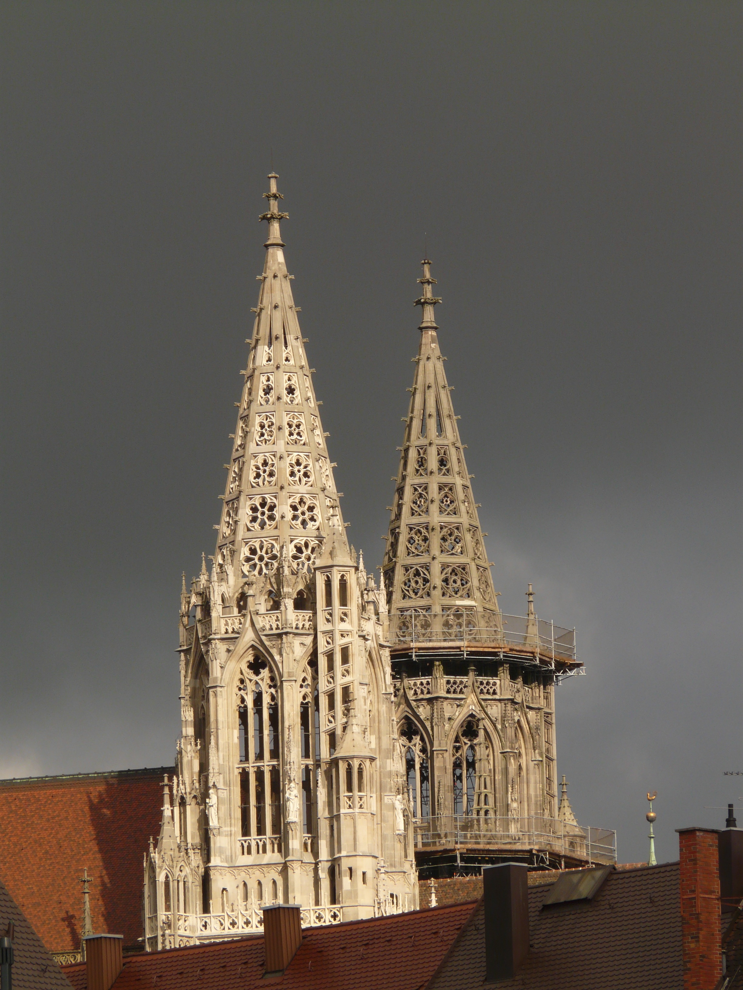 Free image/jpeg, Resolution: 2448x3264, File size: 1.76Mb, spires of ulm cathedral towers at thundery clouds, germany, münster picture with tags: towers, ulm cathedral, münster, church, steeple, architecture