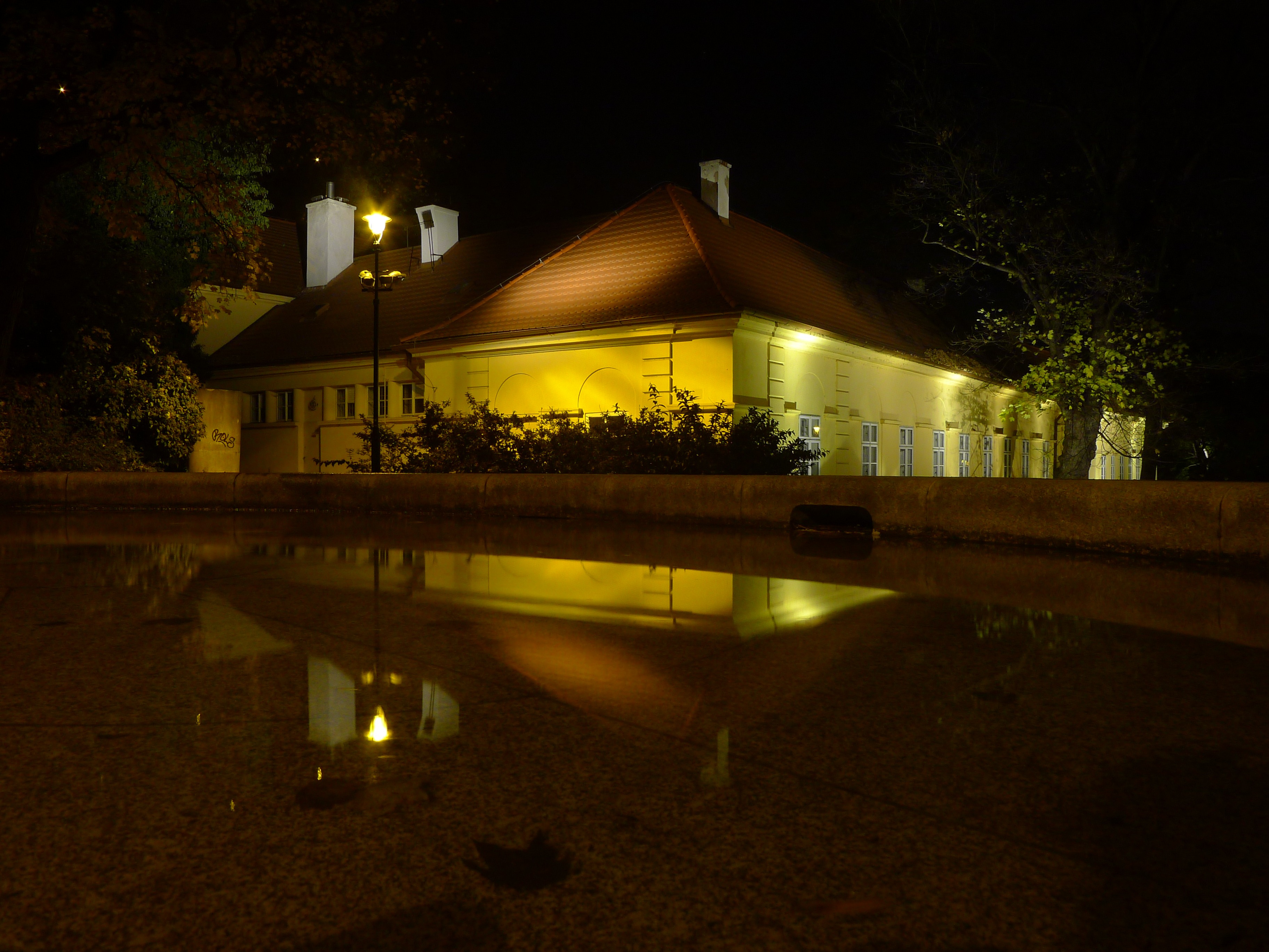 Free image/jpeg, Resolution: 3648x2736, File size: 1.43Mb, old building with tile roof mirroring on pond at night, czech, prague picture with tags: prague, czech republic, building, house, home, architecture, night, lights