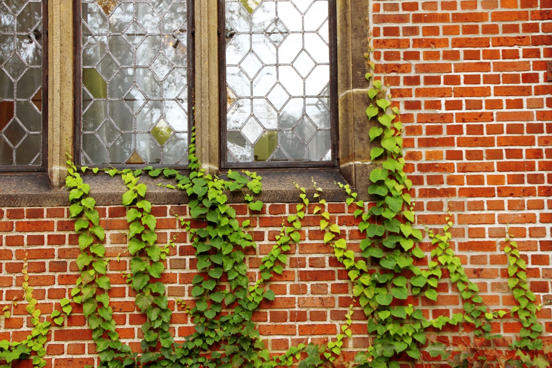 Free image/jpeg, Resolution: 1920x1280, File size: 750Kb, green ivy on red brick wall at window close-up picture with tags: windows, walls, plants, vines, bricks, decorative, buildings, gardens