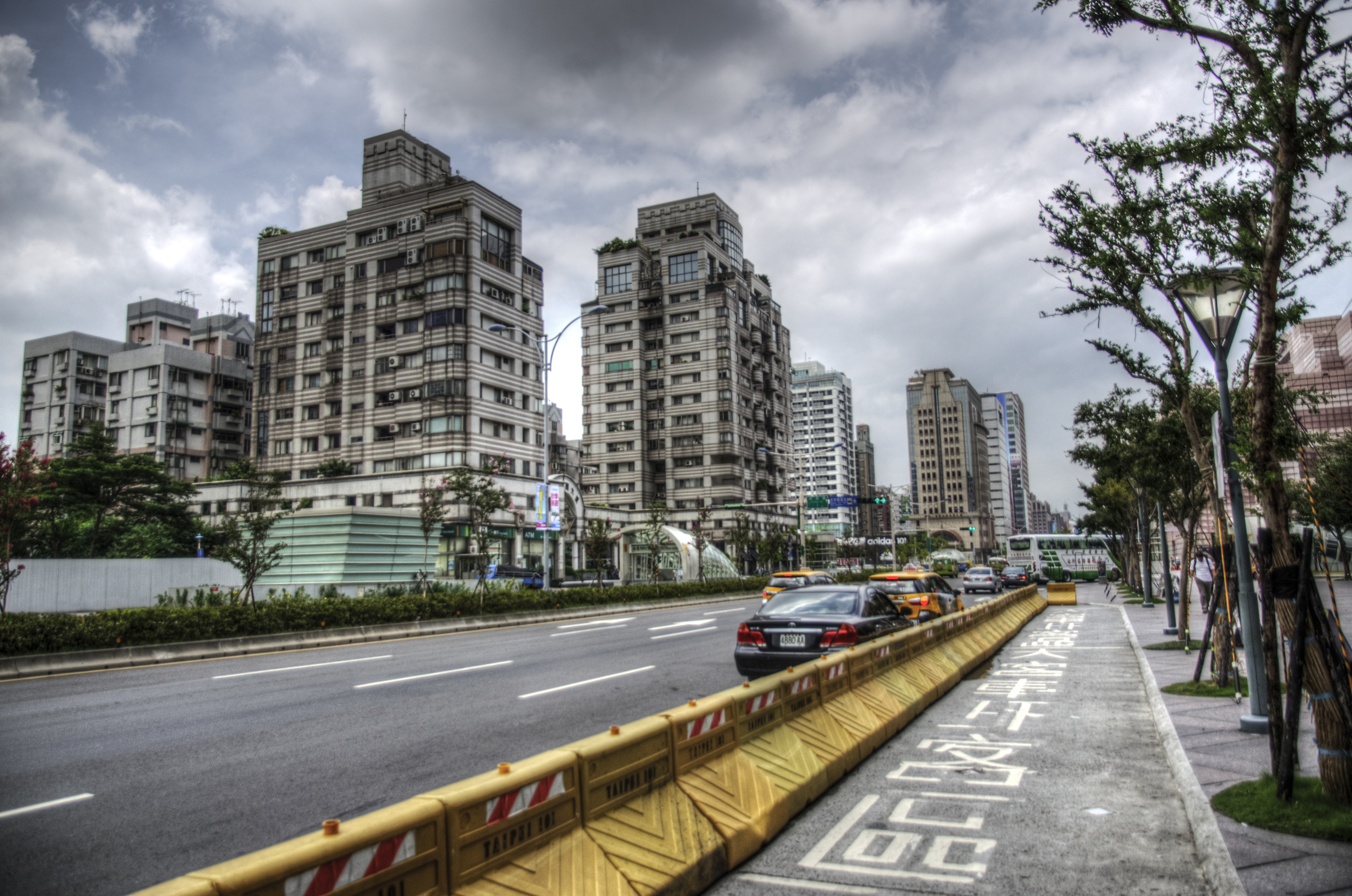 Free image/jpeg, Resolution: 4948x3280, File size: 4.82Mb, street in city at cloudy day, taiwan, taipei picture with tags: taipei, street, dark clouds, building, road