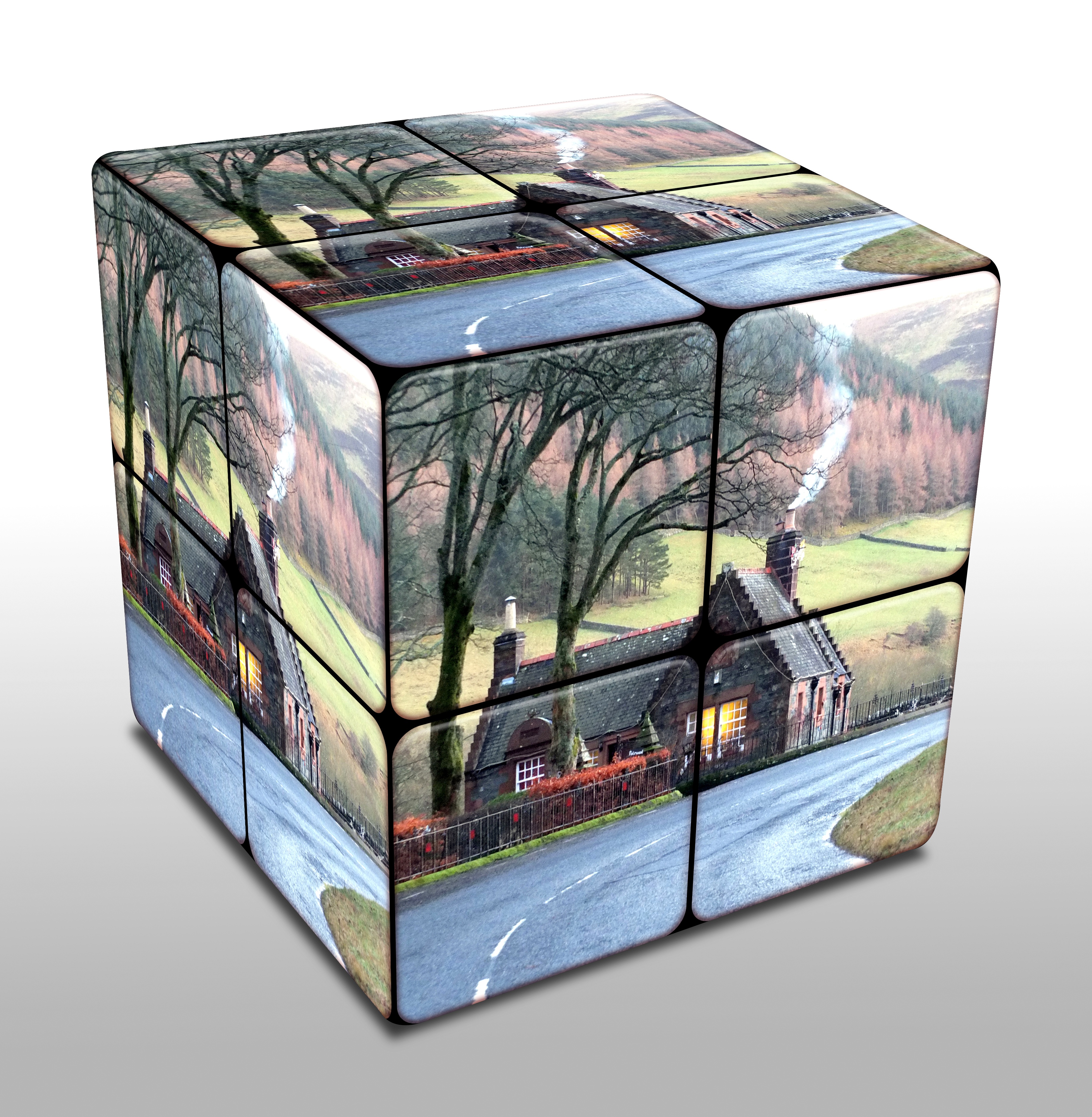 Free image/jpeg, Resolution: 3670x3755, File size: 3.09Mb, cube with image of house in scotland countryside, digital art picture with tags: cube, square, scotland, country, countryside, road, hills