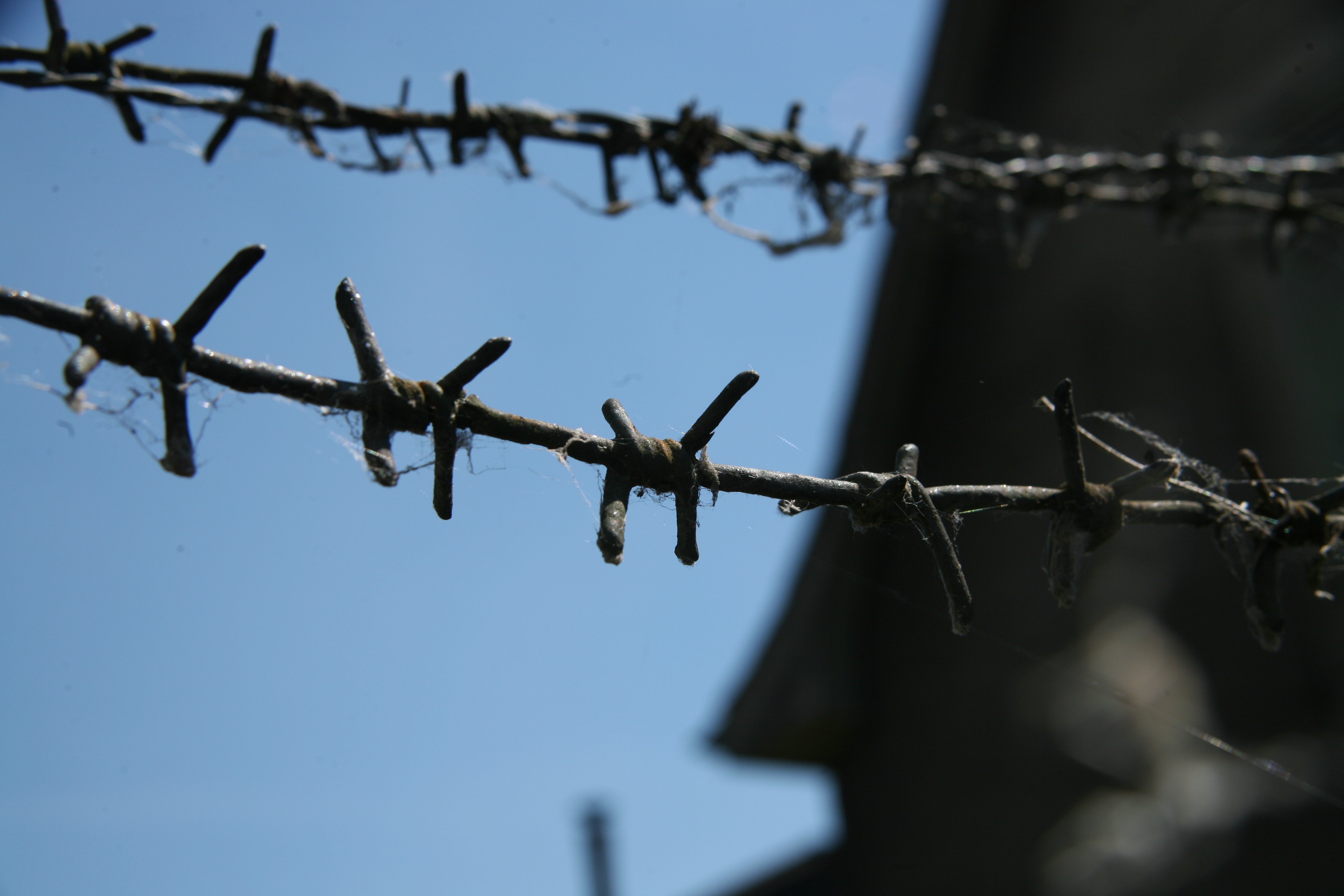 Free image/jpeg, Resolution: 4368x2912, File size: 1.43Mb, two rows of barbed wire at building close-up on blurred background picture with tags: barbed wire, city, closing, danger, blur