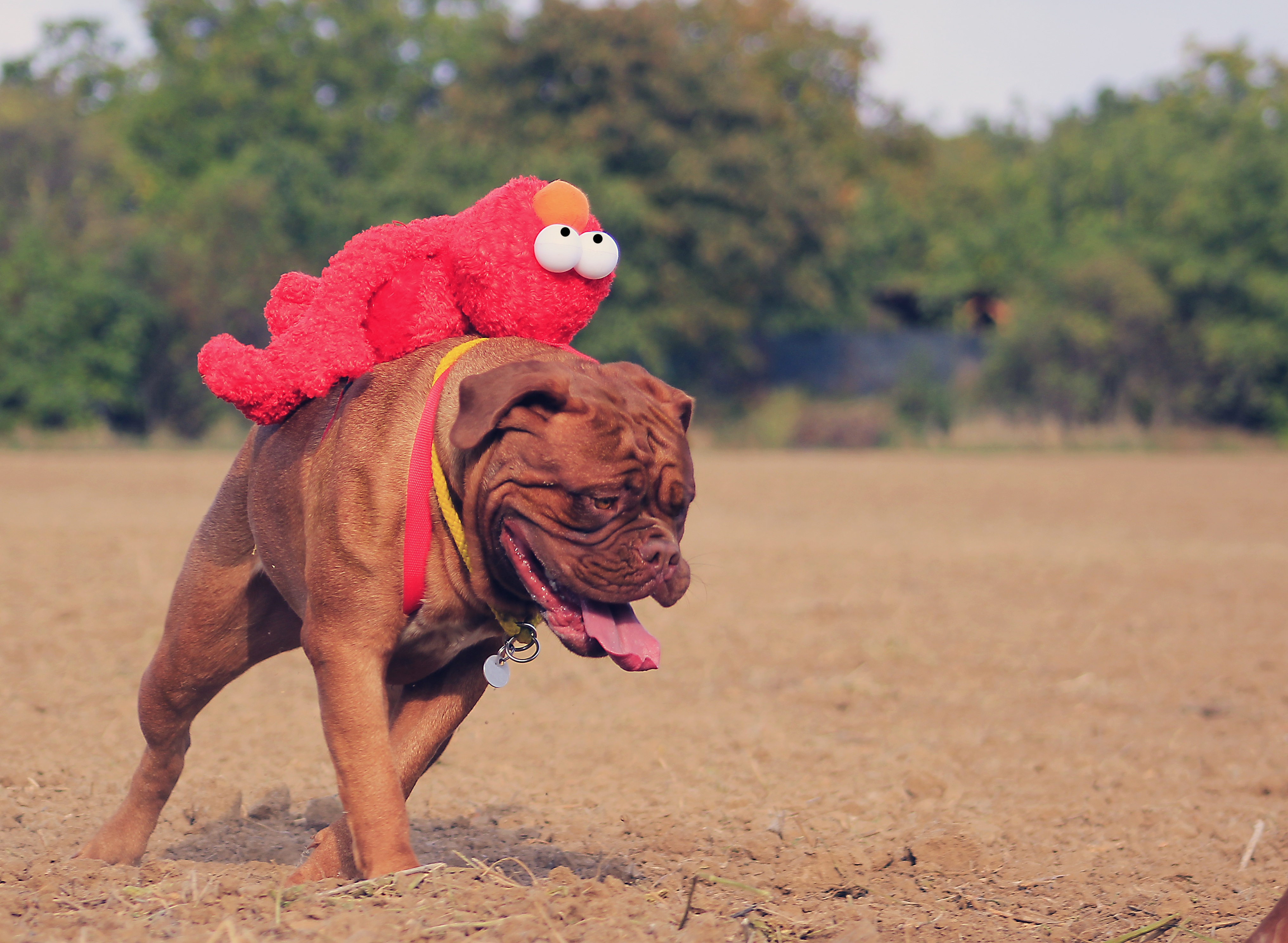 Free image/jpeg, Resolution: 4064x2977, File size: 2.32Mb, bordeaux mastiff dog running with red toy on back picture with tags: mastiff, mastiffs, cute, summer, background, nature, puppy