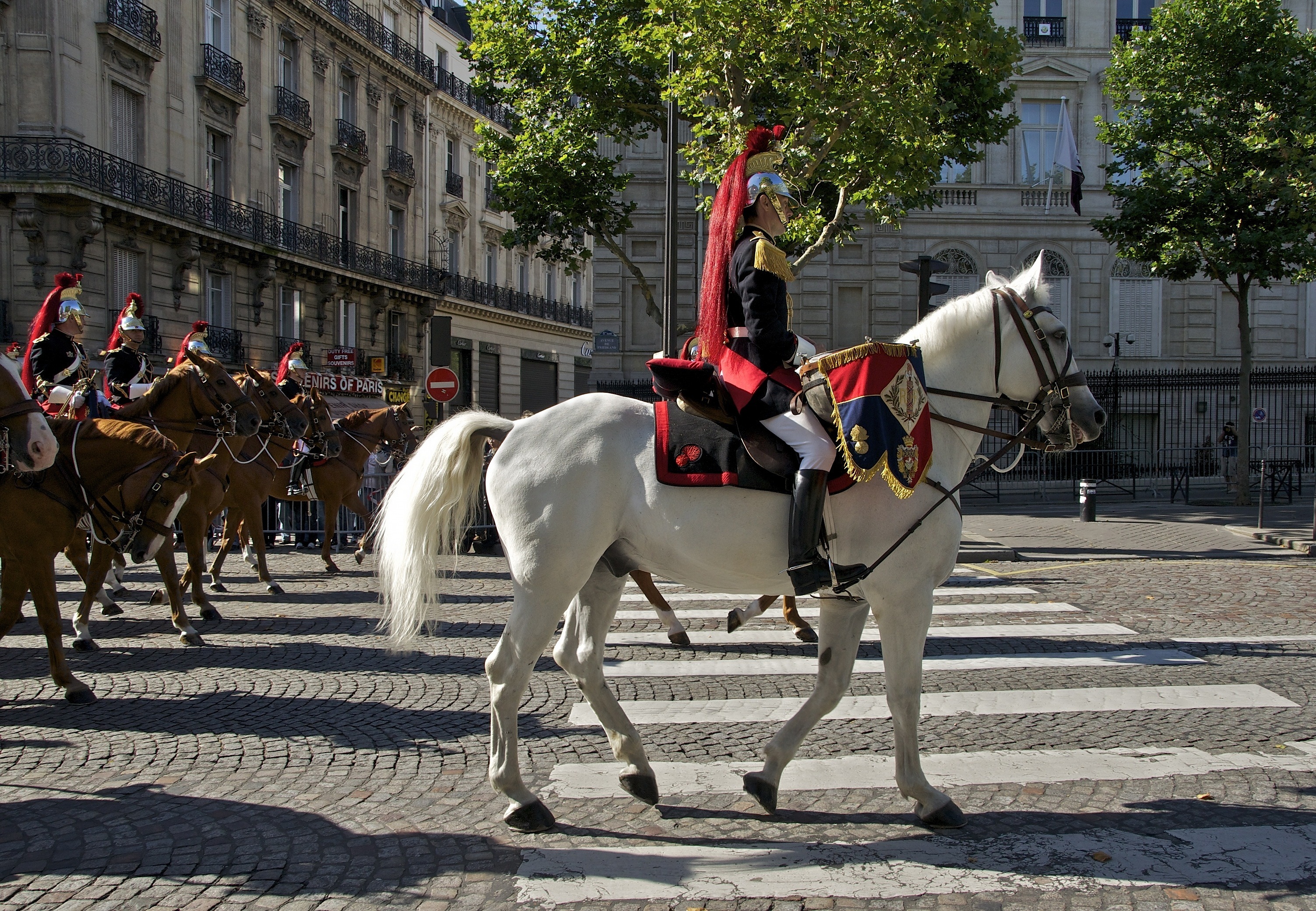 Free image/jpeg, Resolution: 3006x2081, File size: 2.45Mb, cavalry guards parading on street at summer, france, paris picture with tags: paris, france, horses, guard, cavalry, regiment