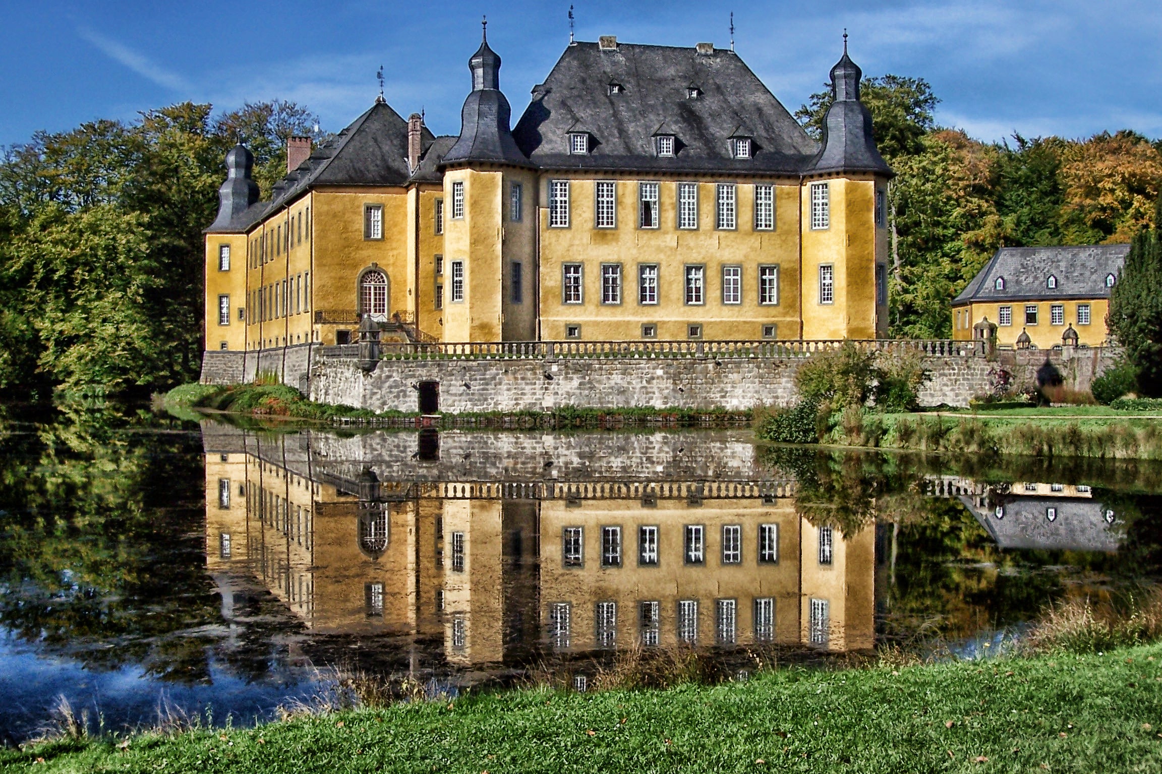 Free image/jpeg, Resolution: 2304x1536, File size: 1.26Mb, Reflection of yellow Dyck Castle in Juchen picture with tags: juchen, germany, dyck castle, building, landmark, destinations