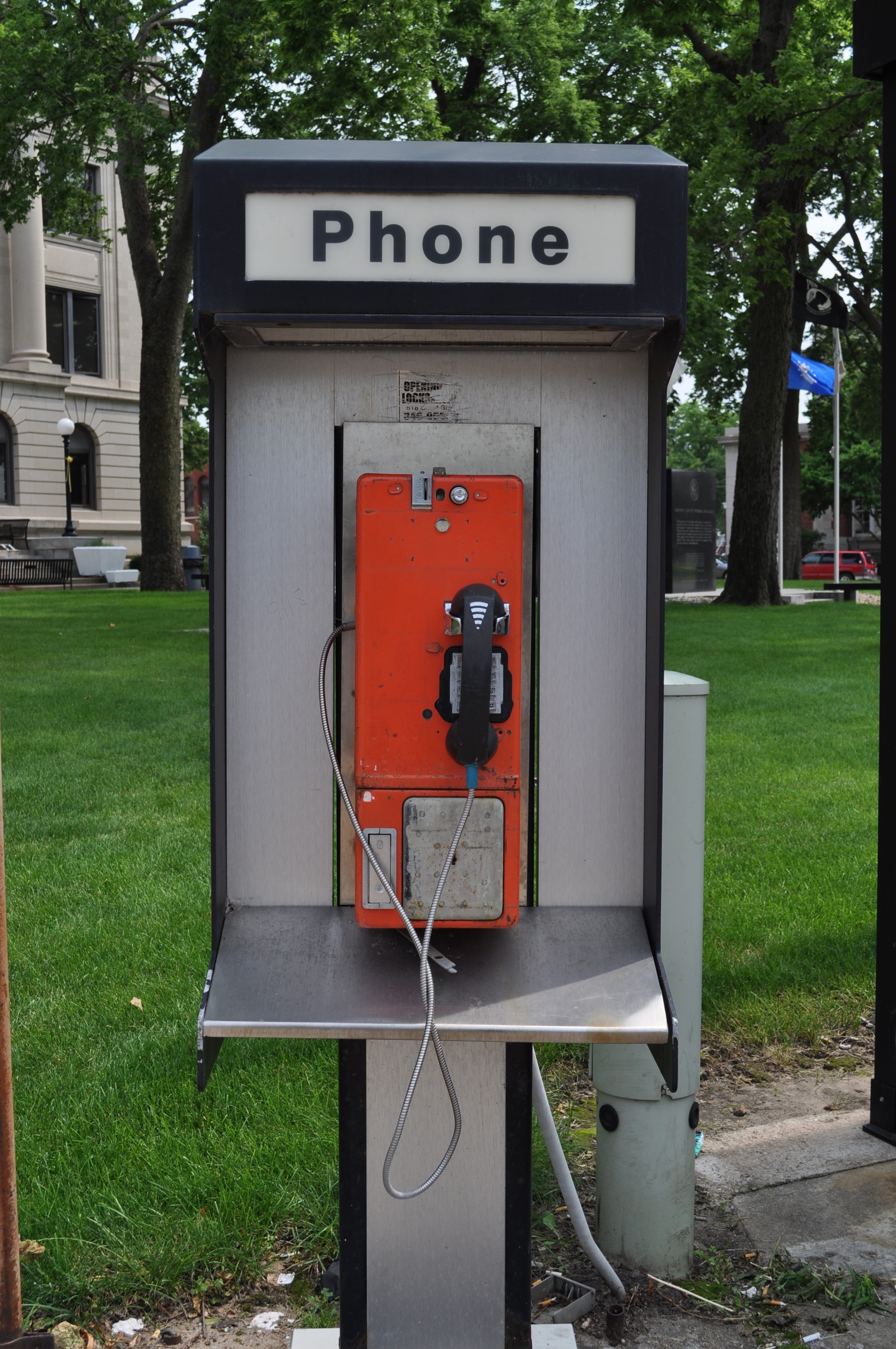 Free image/jpeg, Resolution: 2136x3216, File size: 1.68Mb, phone booth on street in city, usa, illinois, pekin picture with tags: phone, booth, telephone, street, urban, retro, call, illinois