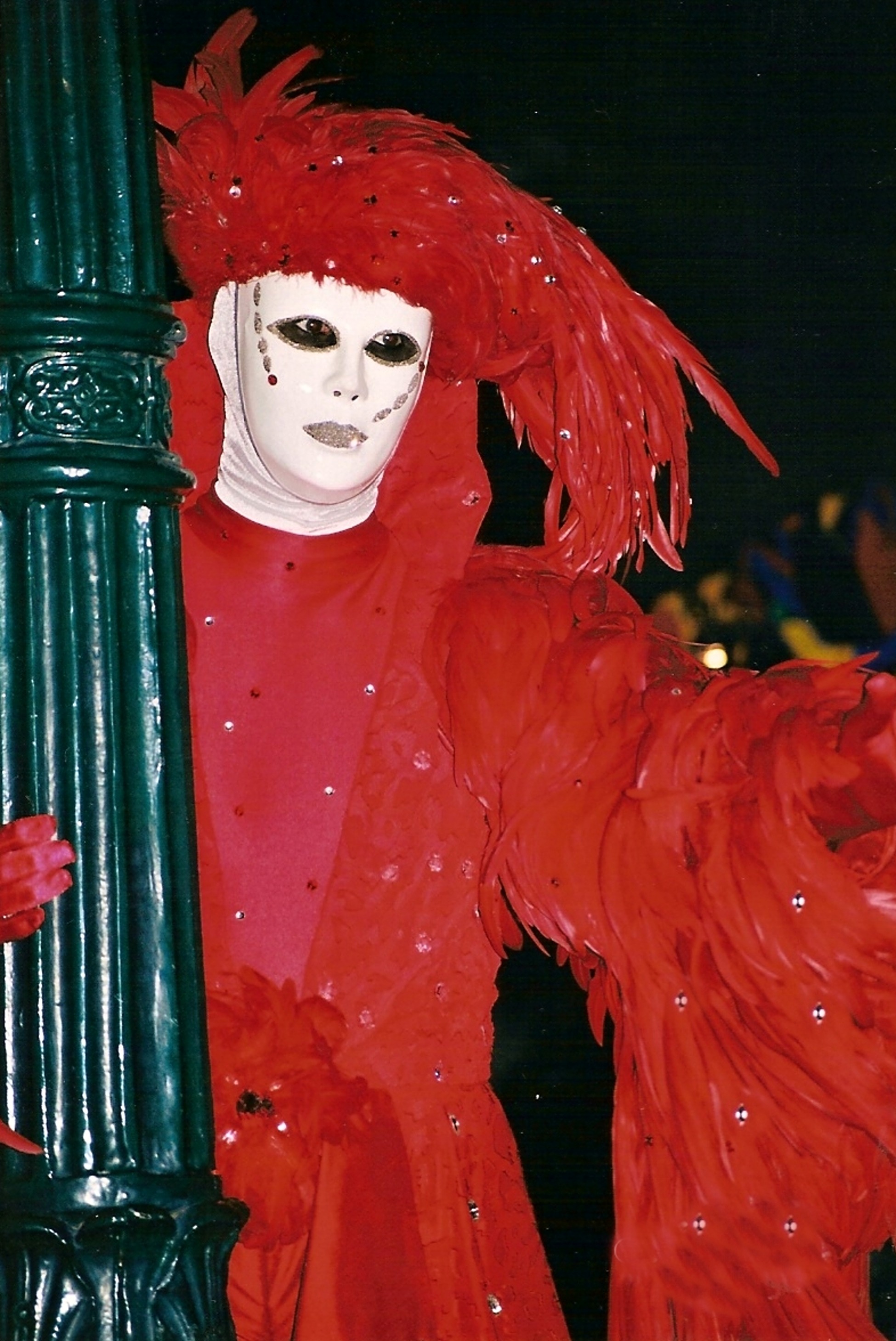 Free image/jpeg, Resolution: 1950x2918, File size: 833Kb, person in red full body carnival costume at pile, italy, venice picture with tags: carnival, masks, venice, panel, costume, move