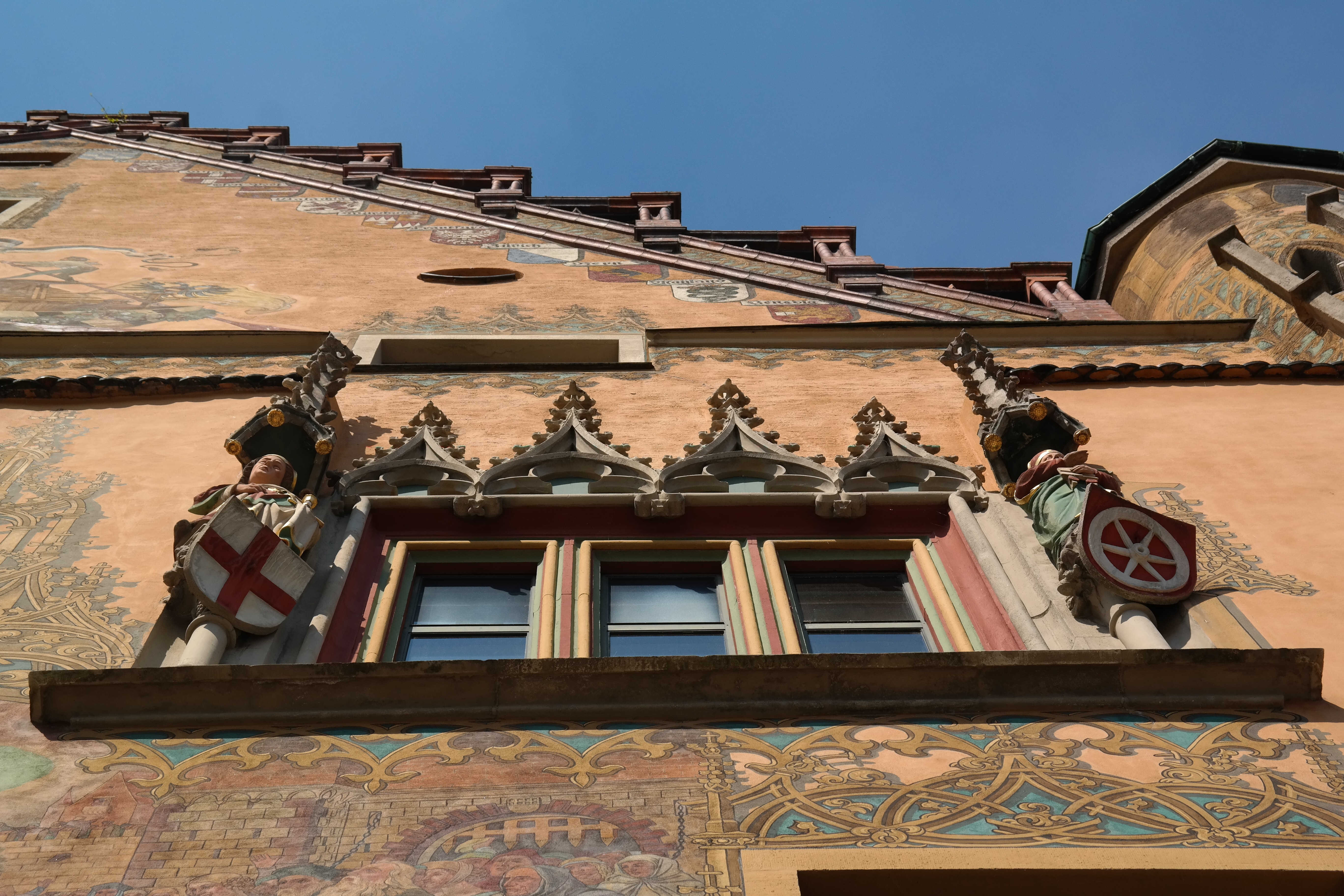 Free image/jpeg, Resolution: 5472x3648, File size: 4.1Mb, Bottom view of the town hall facade picture with tags: town hall, window, facade, ulmer hall, mural, monument, early renaissance, gable