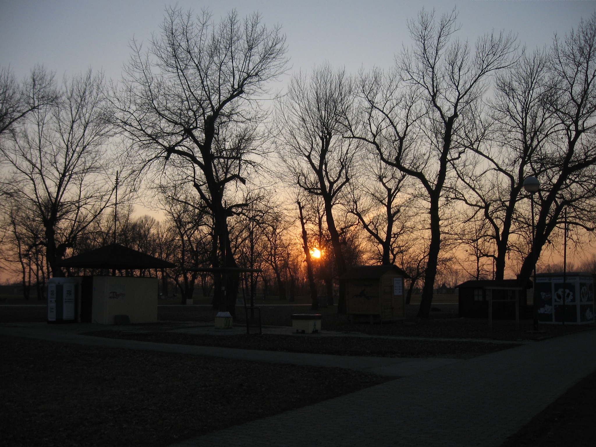 Free image/jpeg, Resolution: 2048x1536, File size: 955Kb, bare trees at sunset sky picture with tags: sunset, park, trees, branches, dark, evening, walkway, buildings