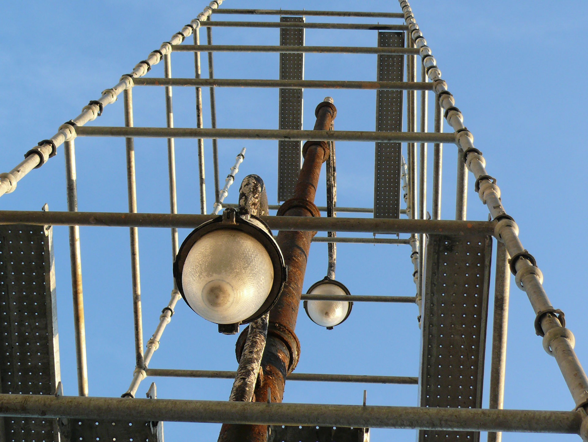 Free image/jpeg, Resolution: 1920x1442, File size: 487Kb, old street lamp in scaffolding, bottom view picture with tags: street lamp, lamp, lighting, light, lantern, lanterns