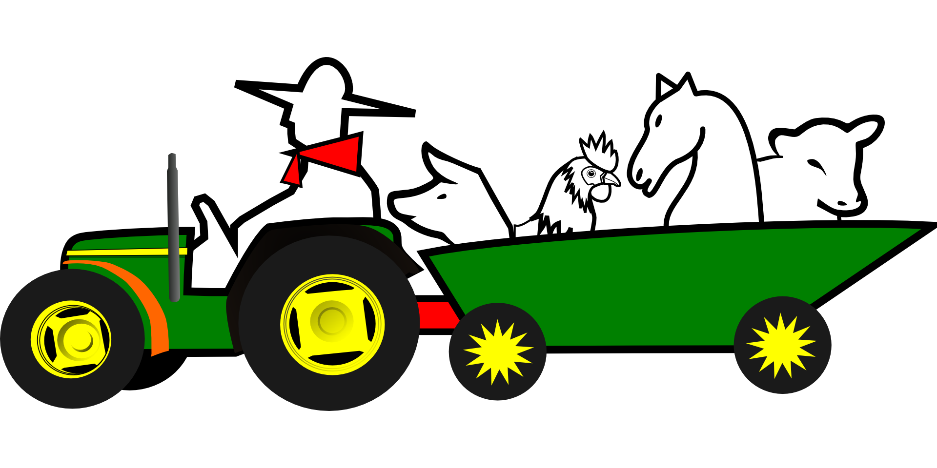 Free image/png, Resolution: 1920x960, File size: 166Kb, farmer driving car with animals, drawing picture with tags: farmer, animals, green, horse, tractor, truck