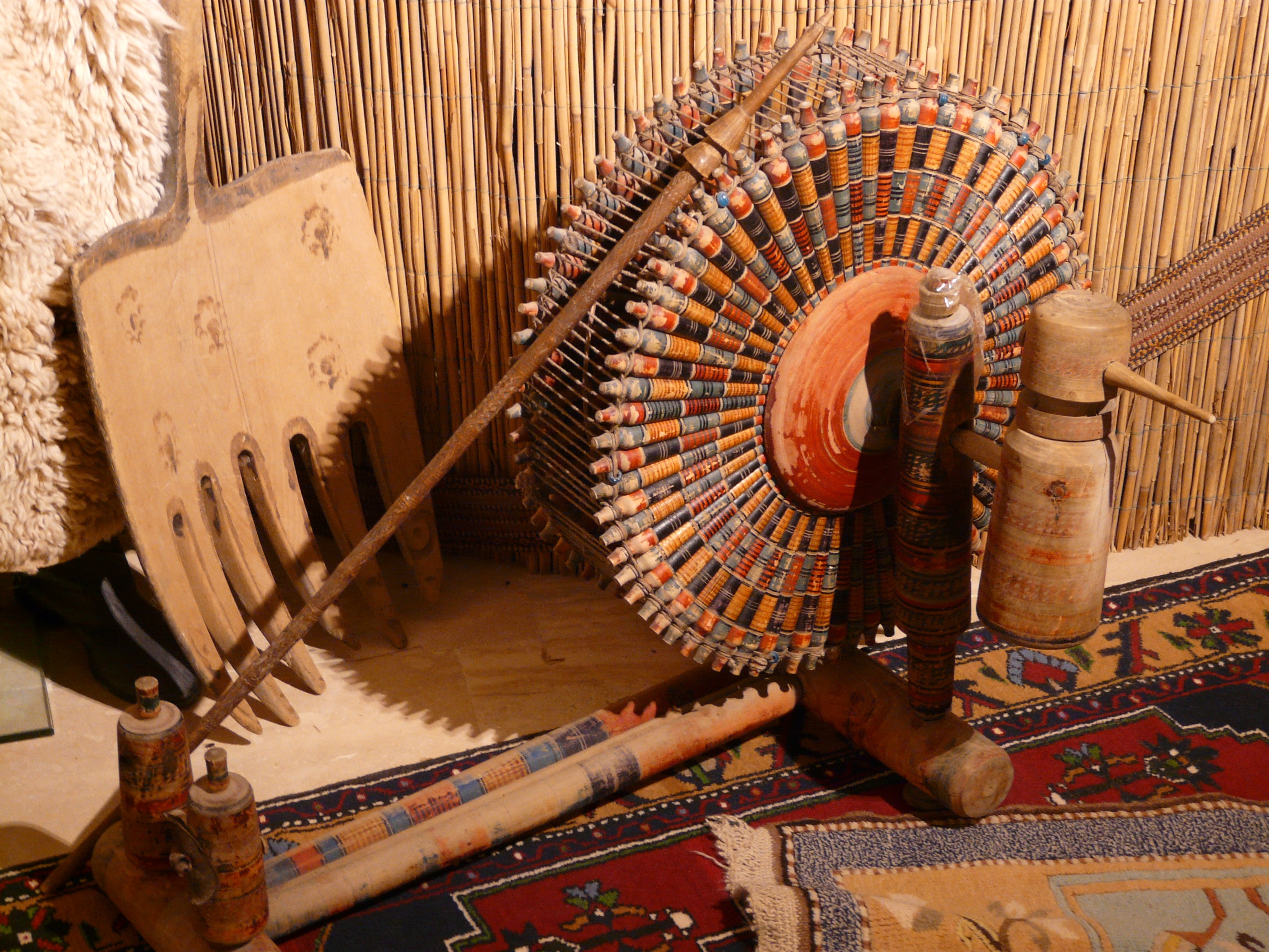 Free image/jpeg, Resolution: 3264x2448, File size: 2Mb, spinning wheel picture with tags: spinning wheel, spindles, carpet weaving center, turkey, asia
