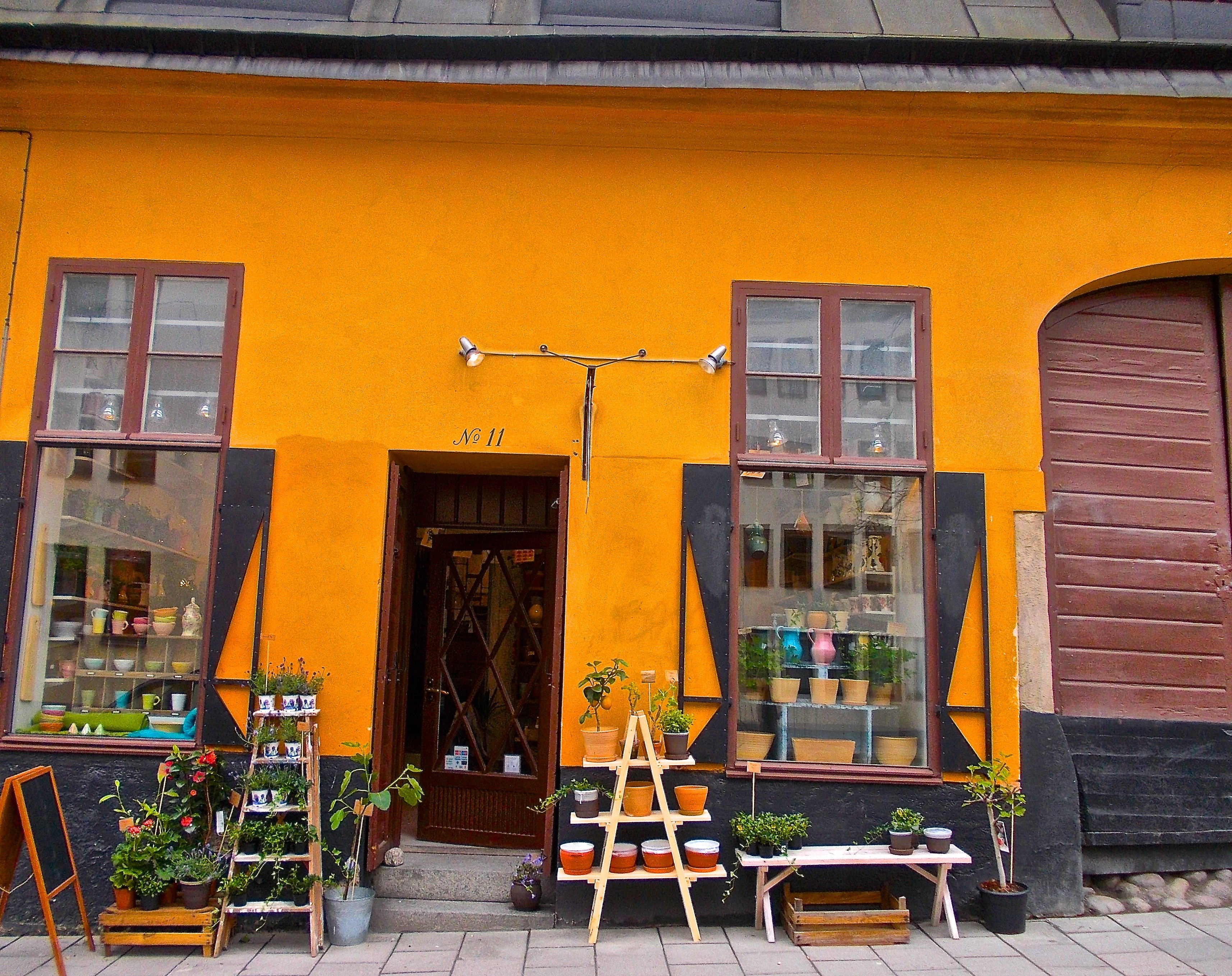 Free image/jpeg, Resolution: 3428x2715, File size: 3.39Mb, potted plants on street at facade of ceramics shop in old city picture with tags: facade, ceramics, shop, city, stockholm, sodermalm