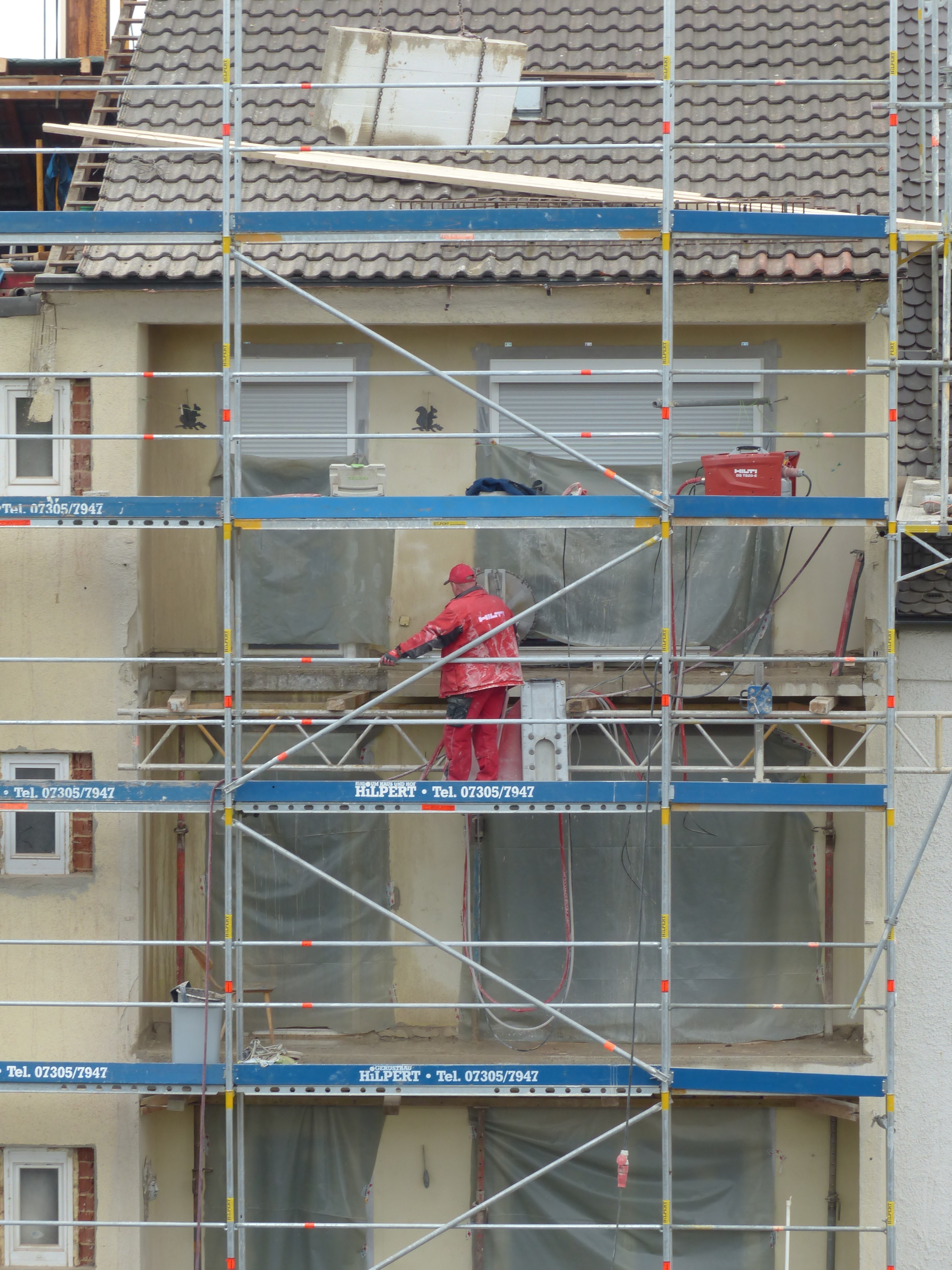 Free image/jpeg, Resolution: 3000x4000, File size: 2.18Mb, Workers on scaffolding near the building picture with tags: house construction, maurer, craftsmen, scaffold, architecture, building, build, house