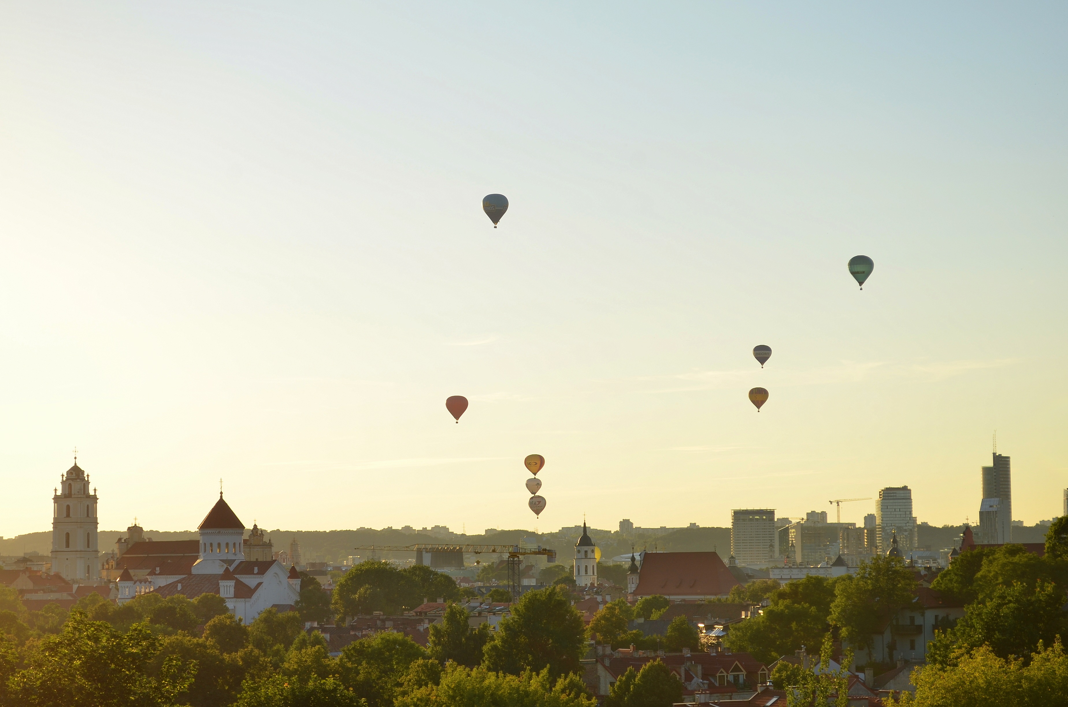 Free image/jpeg, Resolution: 3696x2448, File size: 1.41Mb, hot air balloons at evening sky above summer cityscape picture with tags: sunset, hot air balloons, balloon, landscape, adventure, city, sunny, panorama