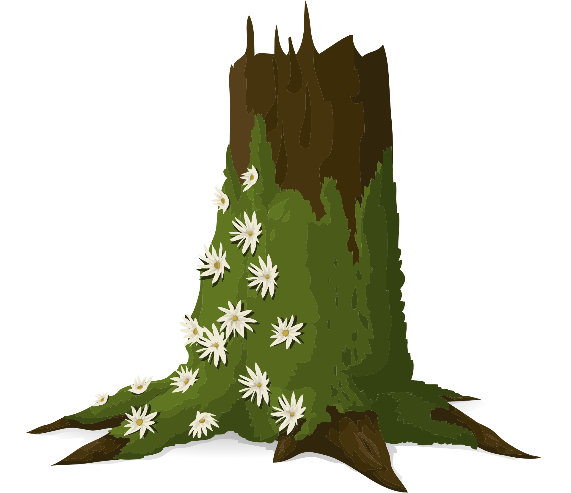 Free image/png, Resolution: 1920x1659, File size: 382Kb, green moss and daisies on a stump as a graphic illustration picture with tags: trees, trunks, moss, green, leafy, plants, woods