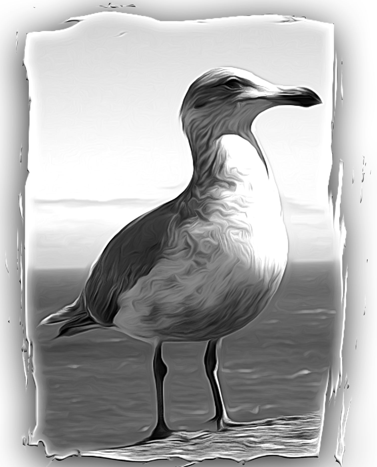 Free image/png, Resolution: 1511x1869, File size: 962Kb, black and white photo of a seagull picture with tags: seagull, bird, feathered, painterly, animal, wild, nature, water