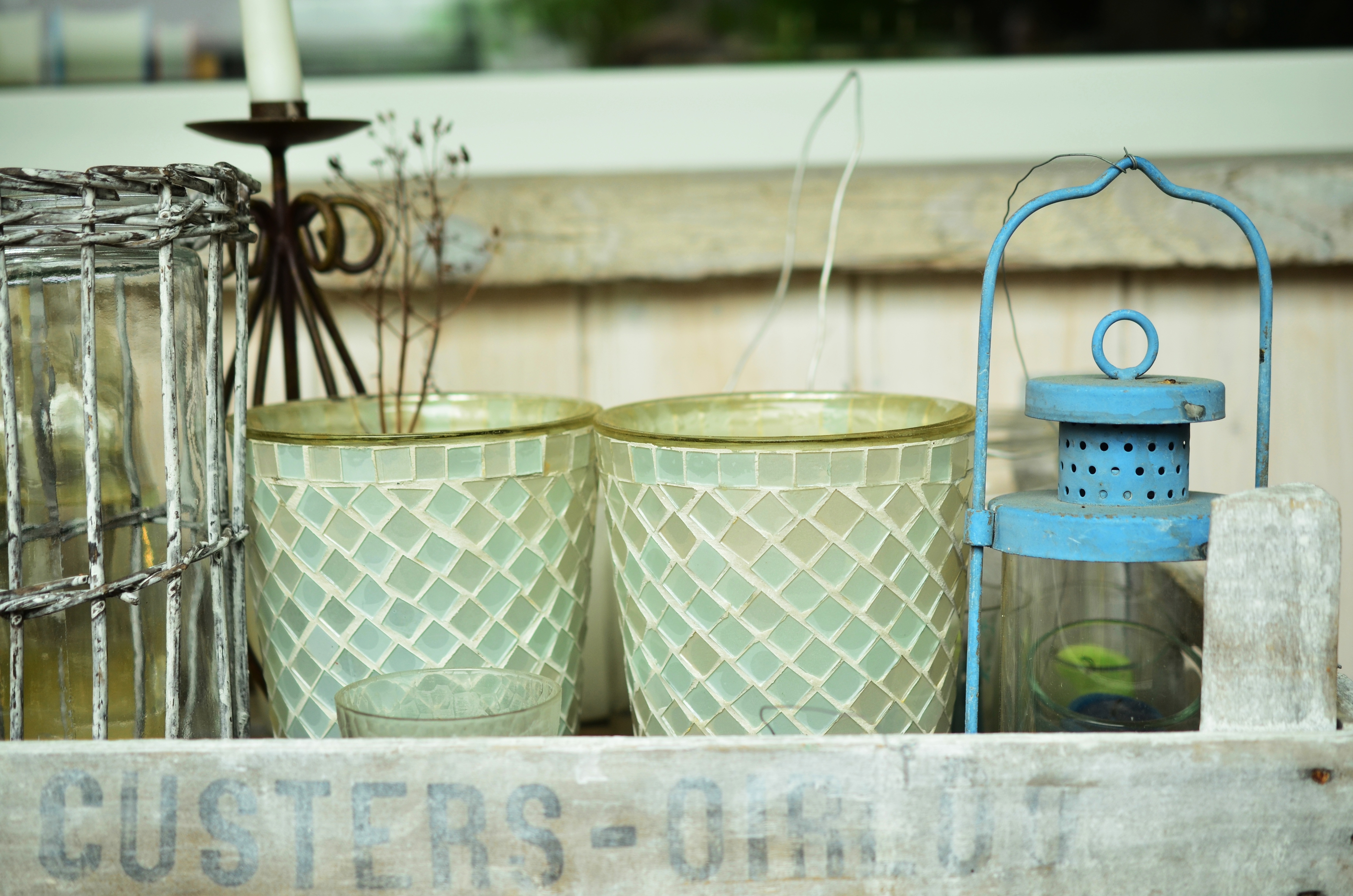 Flower pots and lantern in wooden box