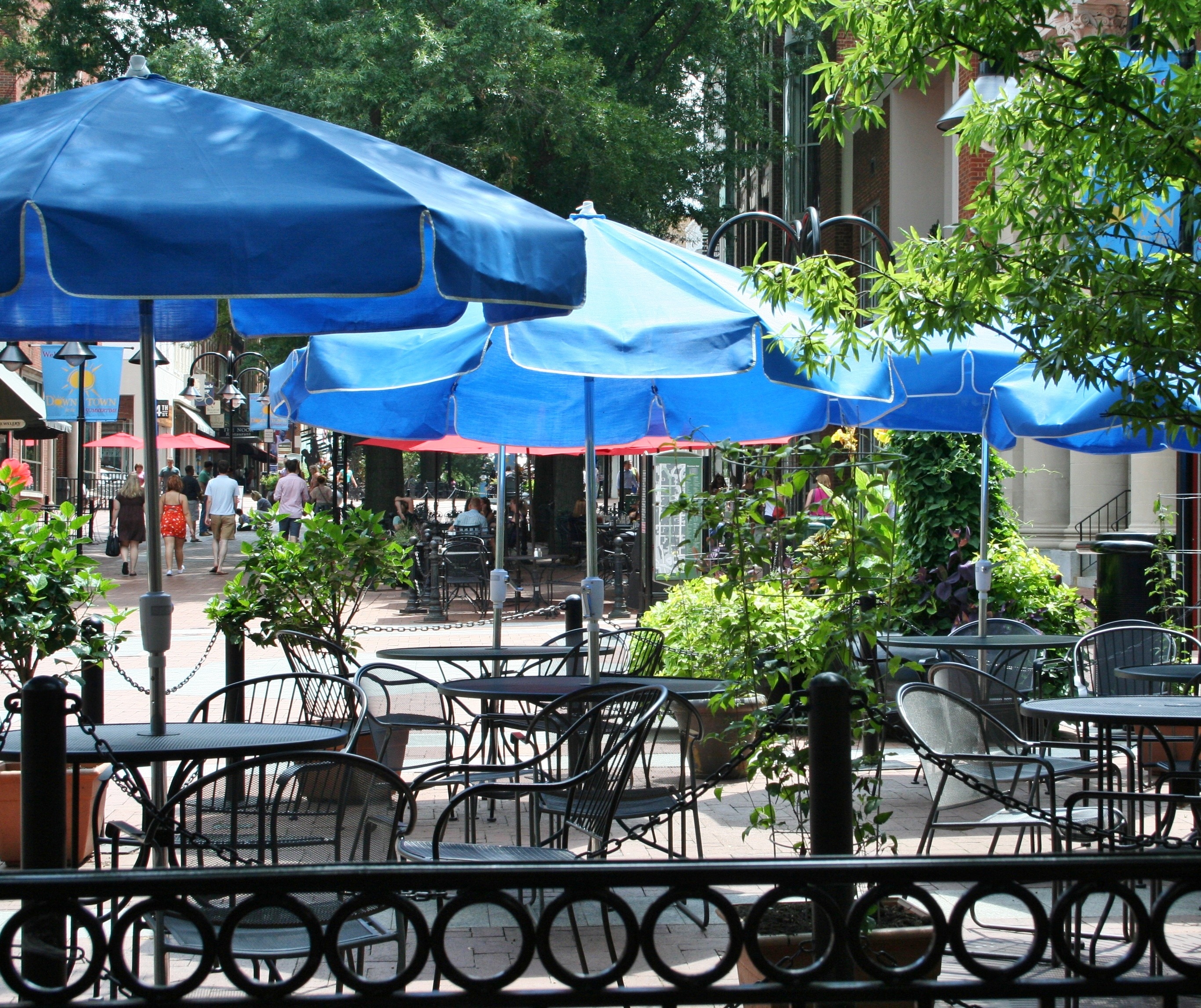 Free image/jpeg, Resolution: 2733x2295, File size: 2.08Mb, sidewalk cafe with blue umbrellas picture with tags: sidewalk cafe, sidewalk restaurant, tables, chairs