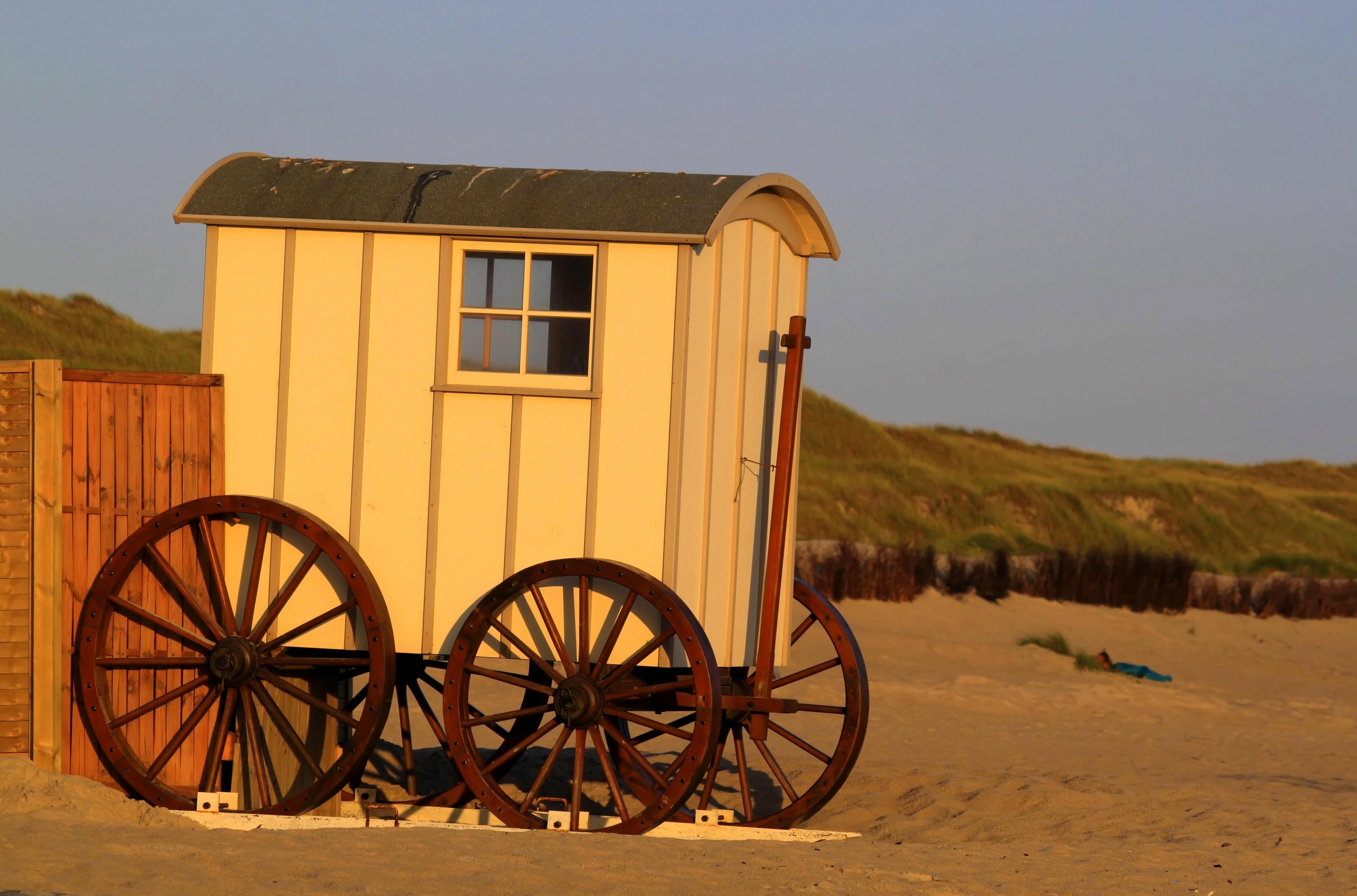 Free image/jpeg, Resolution: 4706x3109, File size: 1.06Mb, unusual beauty landscape of changing room on beach picture with tags: cart, wood, wheels, beach, dunes, coast, changing, room