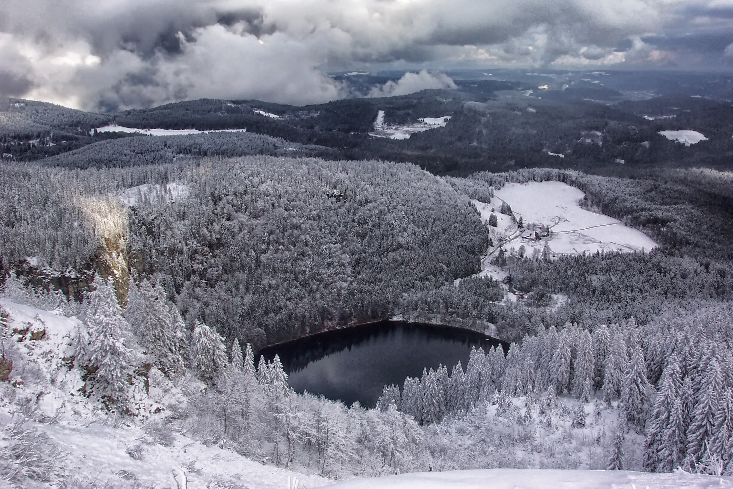 Free image/jpeg, Resolution: 2448x1632, File size: 1.23Mb, landscape with dark scenic forest and a lake picture with tags: germany, scenic, frost, lake, water, outside, nature