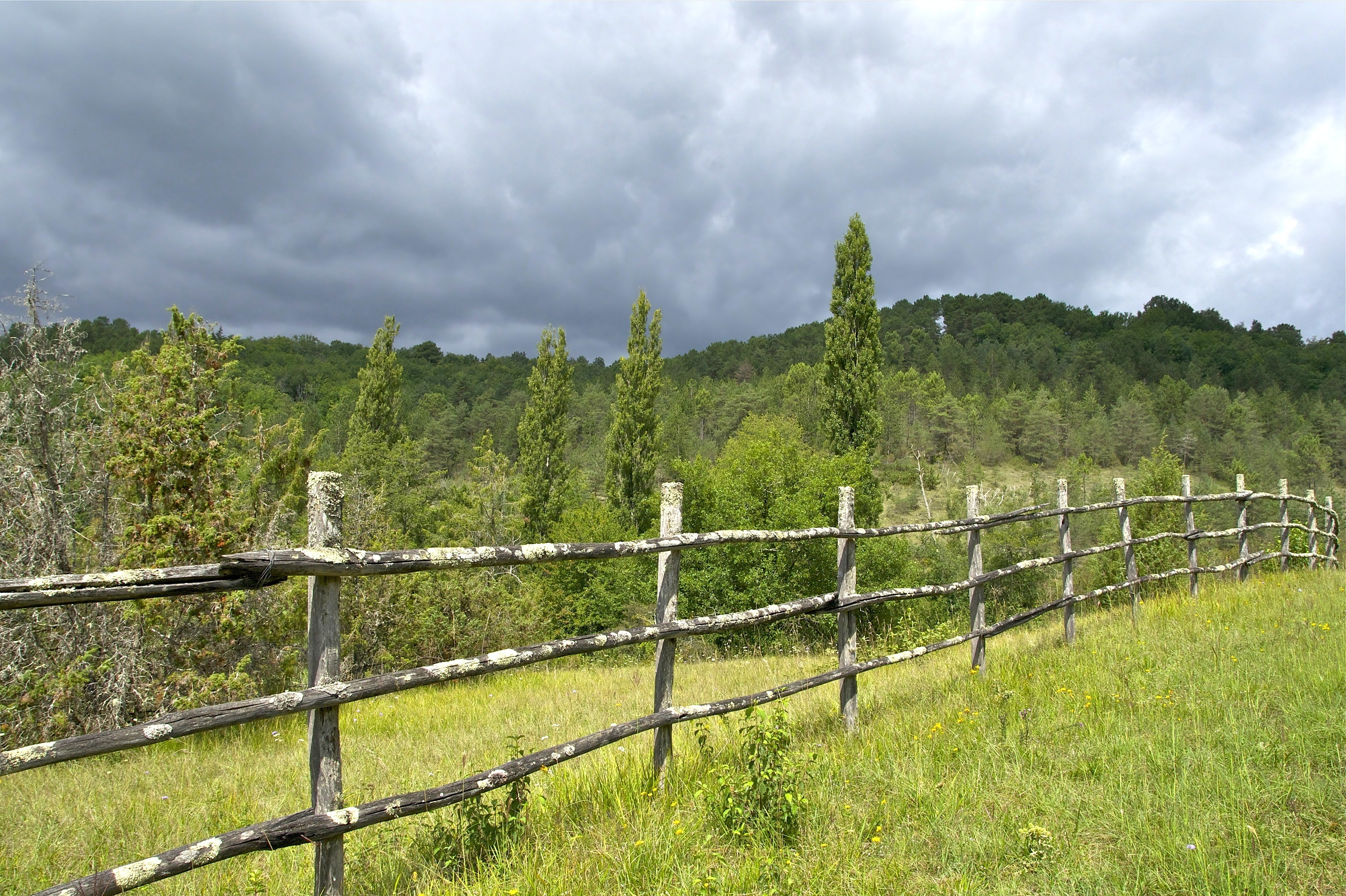 Free image/jpeg, Resolution: 3101x2064, File size: 2.47Mb, wooden fence in france landscape picture with tags: france, fence, landscape, forest, trees, woods, clouds, farm