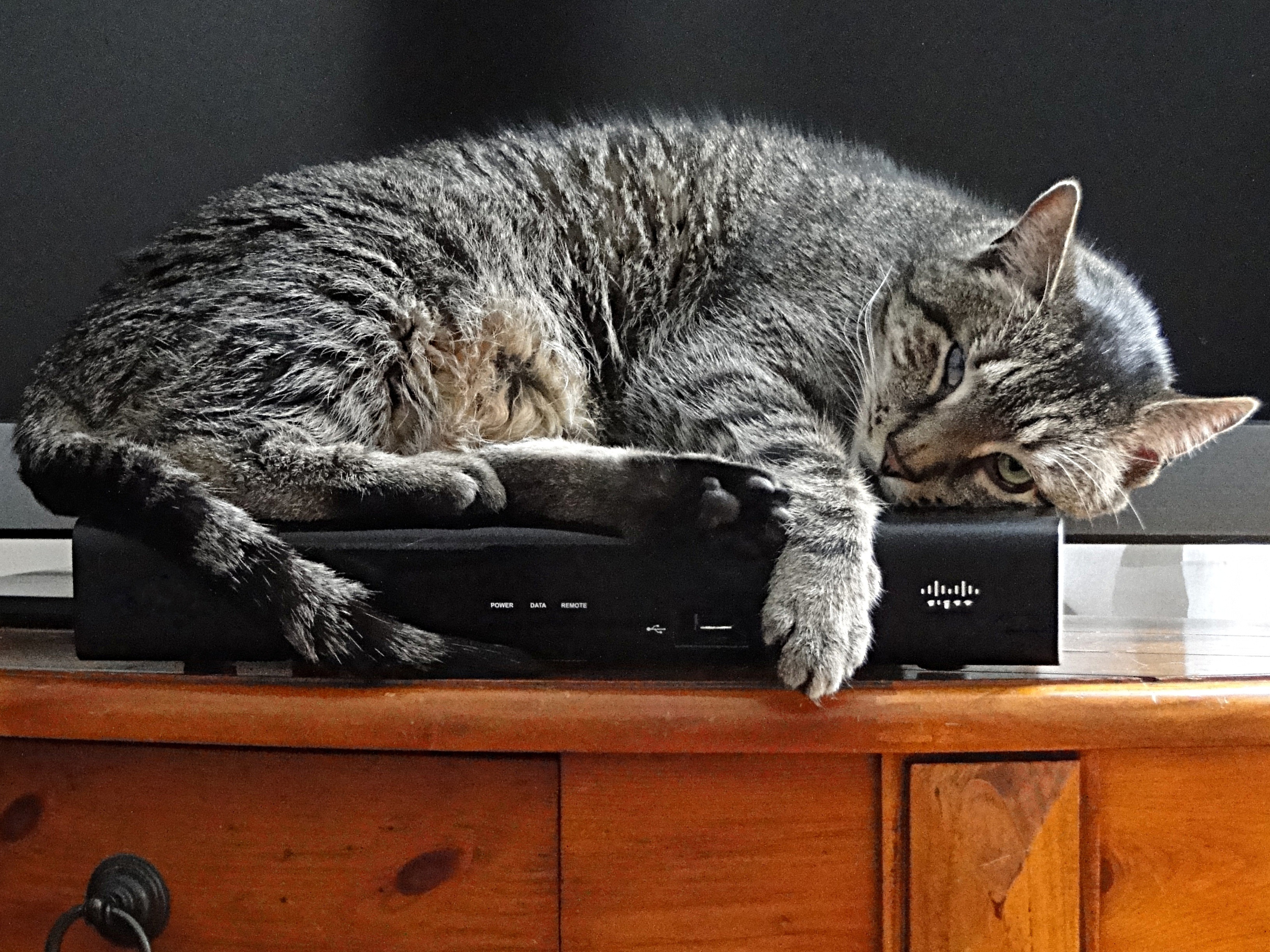 Free image/jpeg, Resolution: 3261x2446, File size: 2.78Mb, sleeping cat on home appliances picture with tags: sleeping, kitty, tiger, stripes, lounging, rest, tired