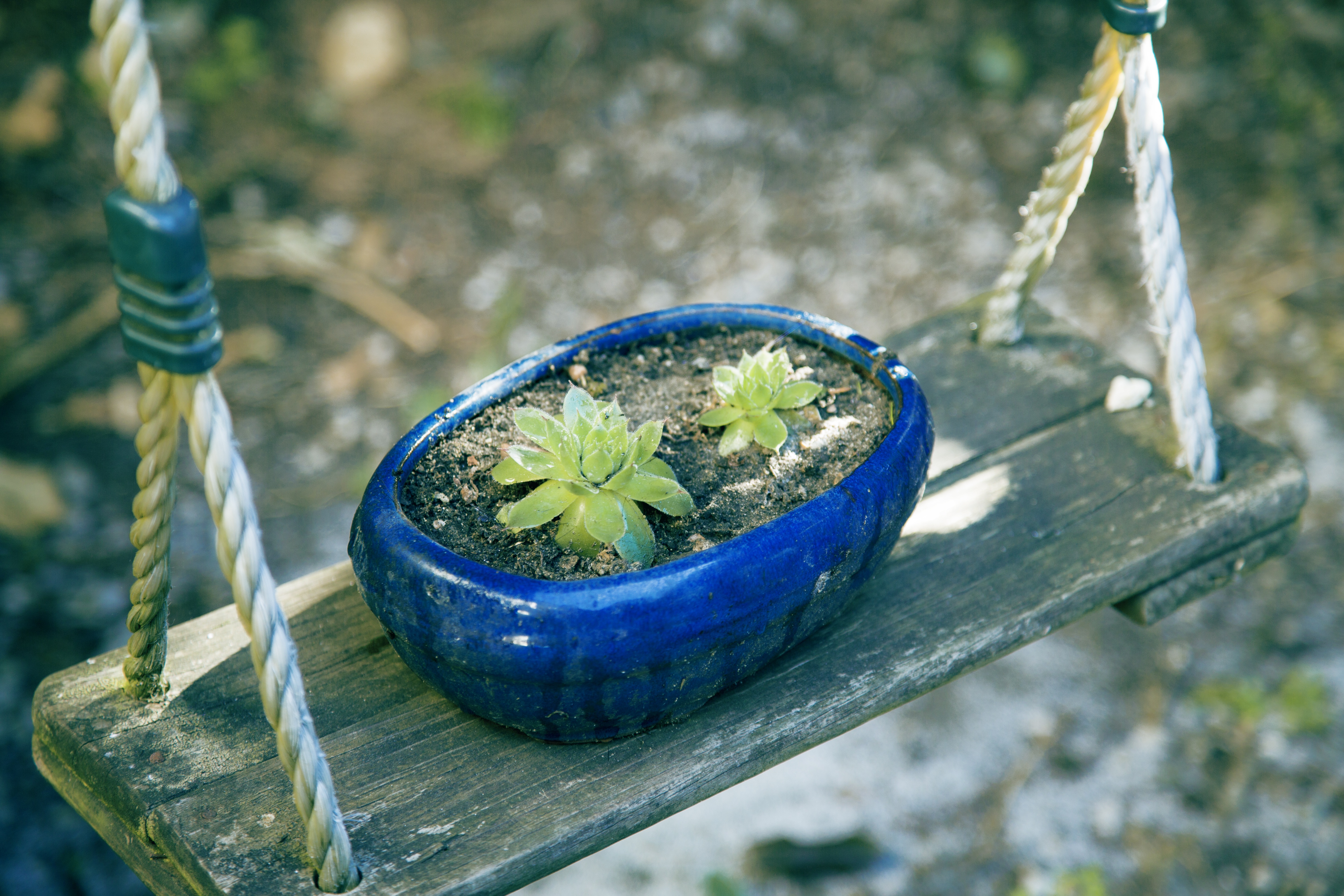 Free image/jpeg, Resolution: 5760x3840, File size: 5.72Mb, small fresh potted plants in a blue pot on a wooden swing picture with tags: potted plants, small fresh, plant, blur, japan