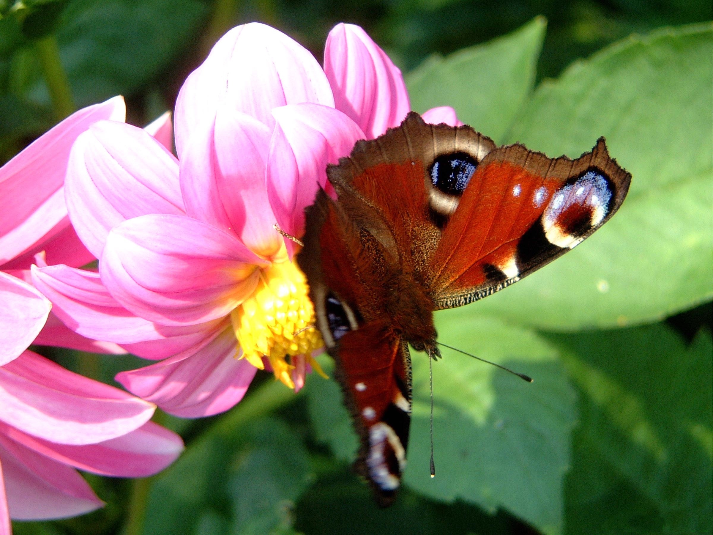Free image/jpeg, Resolution: 2400x1800, File size: 583Kb, spotted butterfly on pink dahlias close-up picture with tags: butterfly, insect, flower, dahlia, flowers, nature, plant