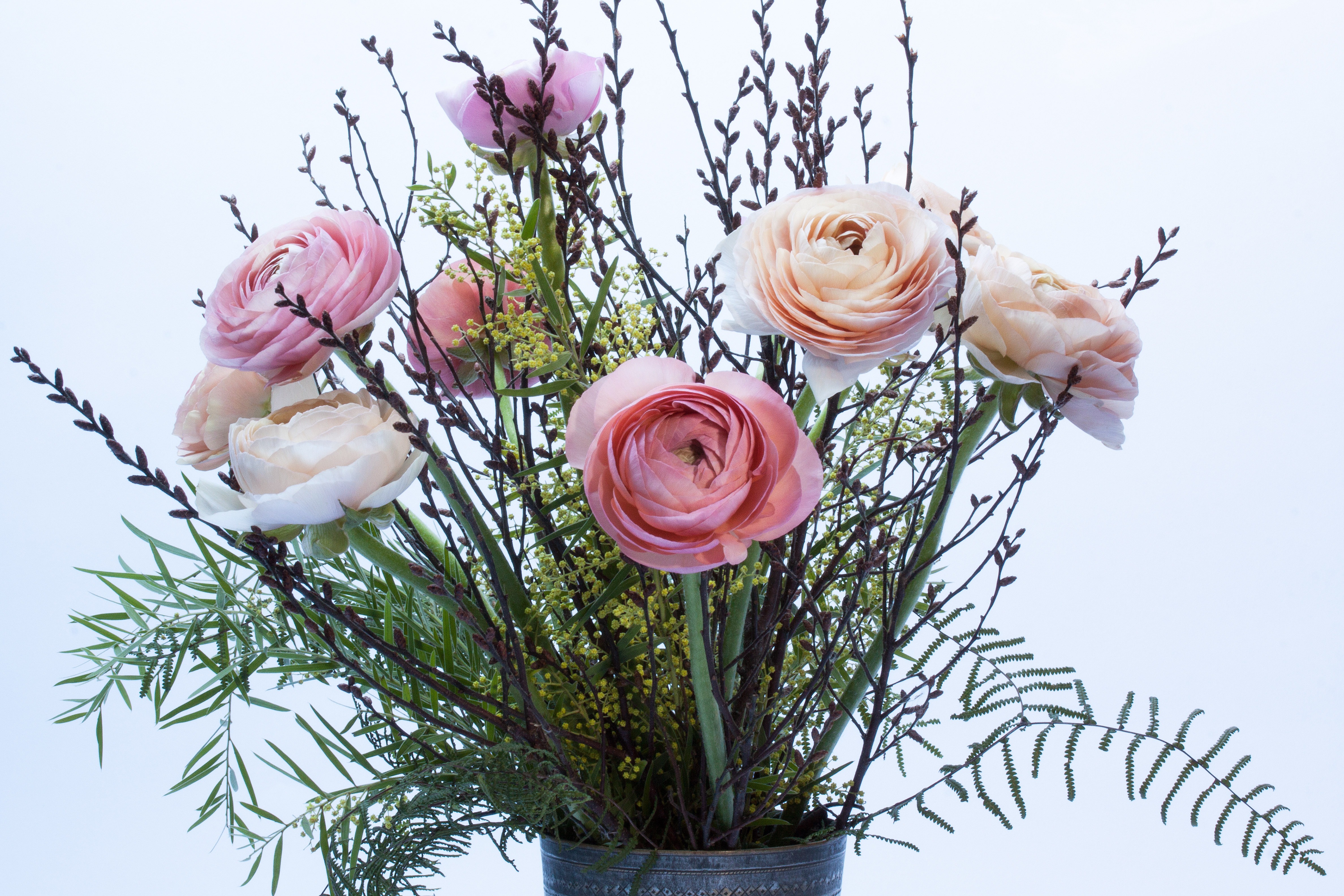Free image/jpeg, Resolution: 4752x3168, File size: 3.3Mb, spring bouquet with flowers in a vase picture with tags: ranunkeln, flowers, plant, salmon, pink, bouquet, mimosa, coral fern