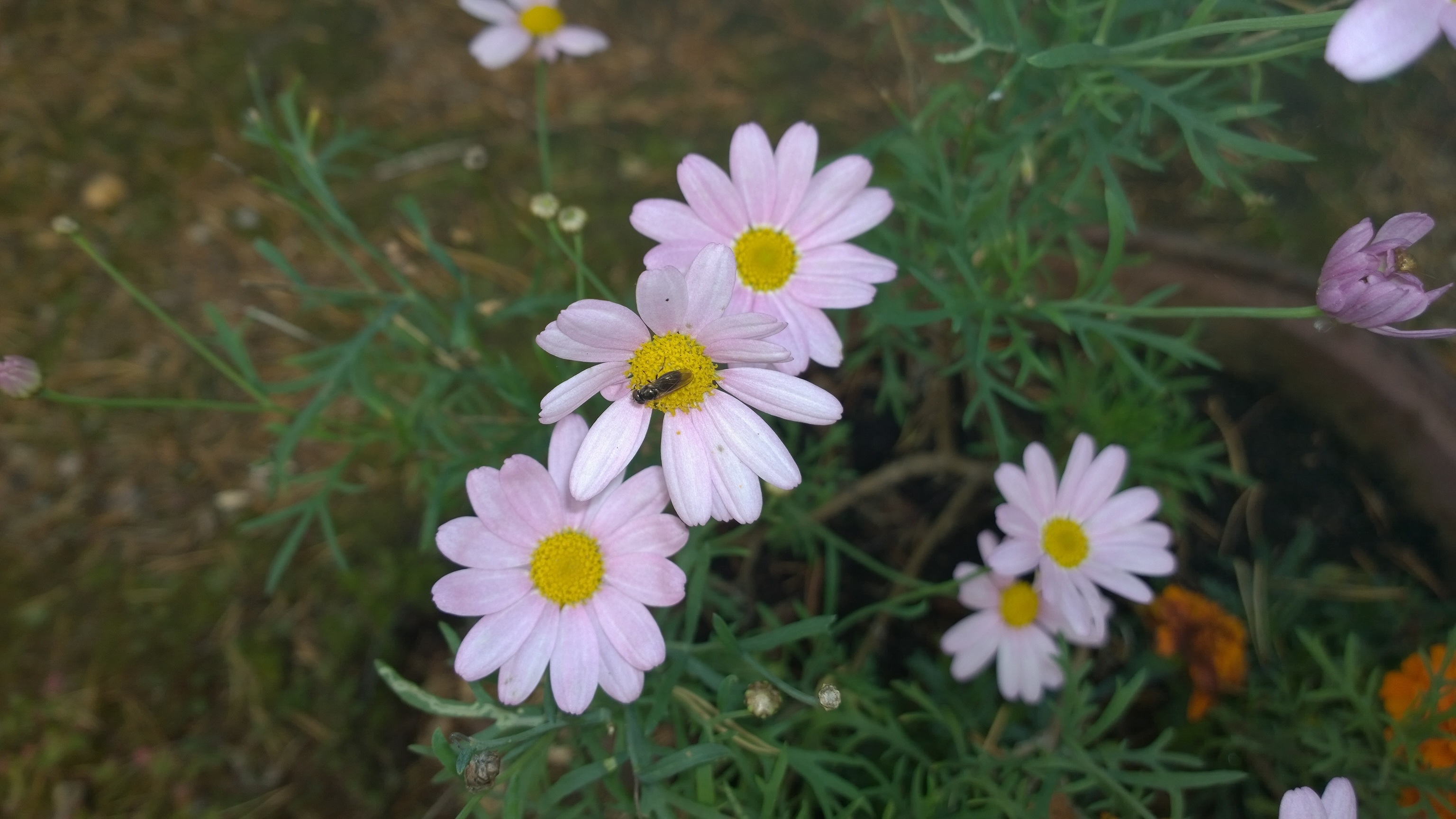 Free image/jpeg, Resolution: 3072x1728, File size: 999Kb, bush of pink daisy in a green meadow picture with tags: pink, petals, hoverfly, plant, flowers, garden, daisy