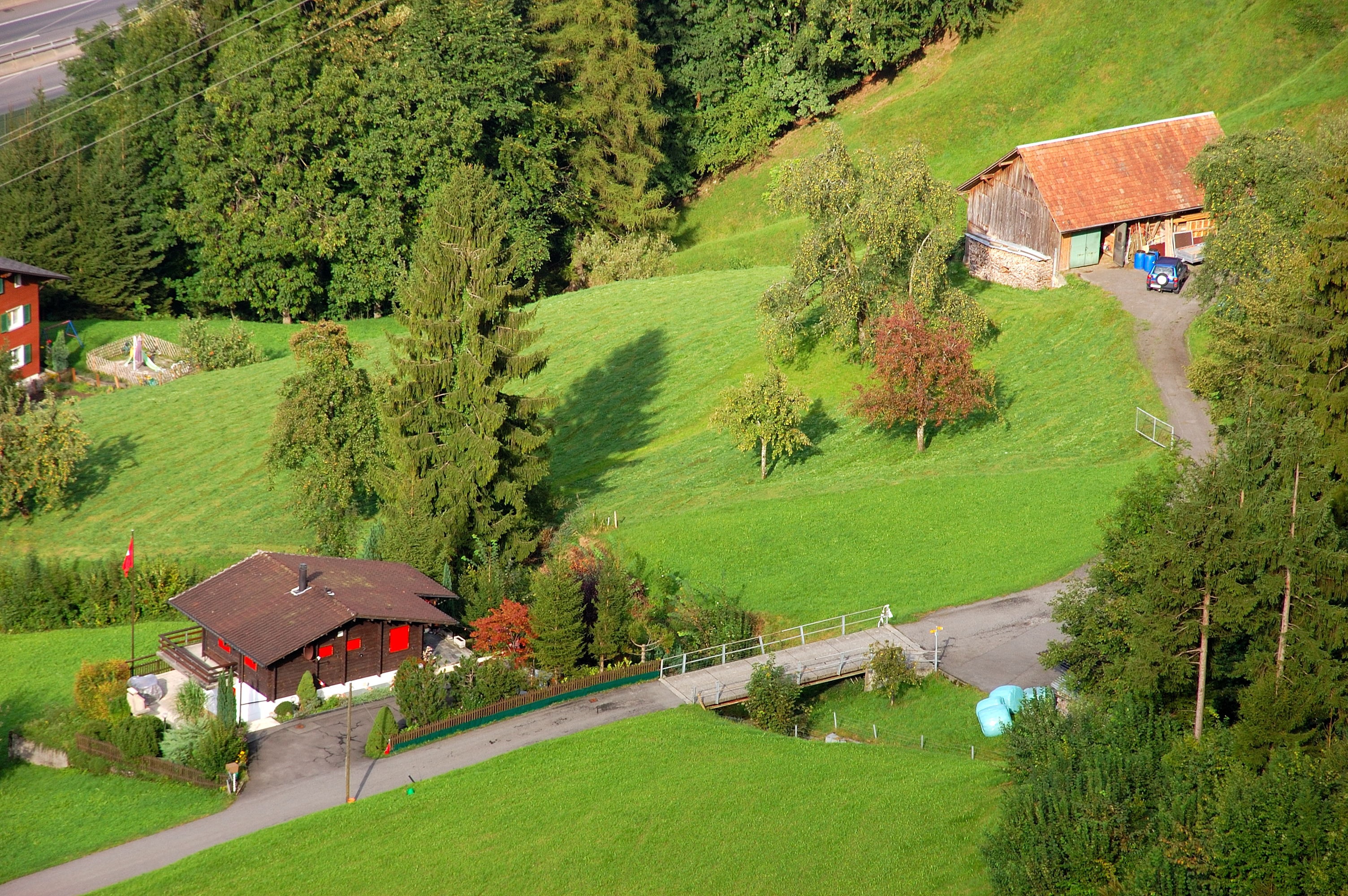 Free image/jpeg, Resolution: 3008x2000, File size: 1.98Mb, mountain village in switzerland picture with tags: farm, meadow, green, road, mountains, switzerland