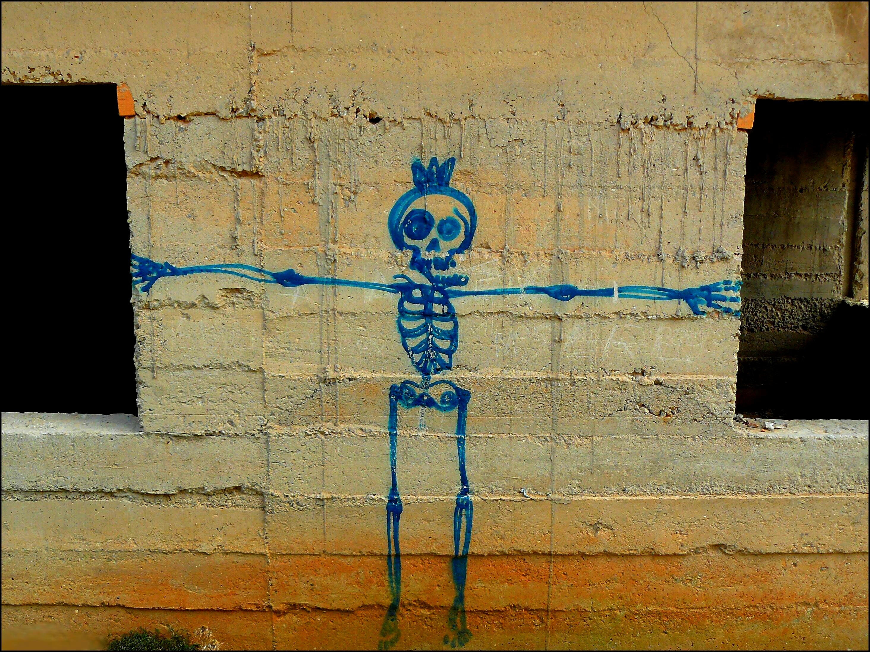 Free image/jpeg, Resolution: 2927x2193, File size: 1.58Mb, skeleton on a building facade picture with tags: home, building, wall, window, facade, architecturedown, skeleton, hauswand, graffity, skull and crossbones, graffiti, wall painting, spain, mallorca, frame, bone, painting, sprayer, spra
