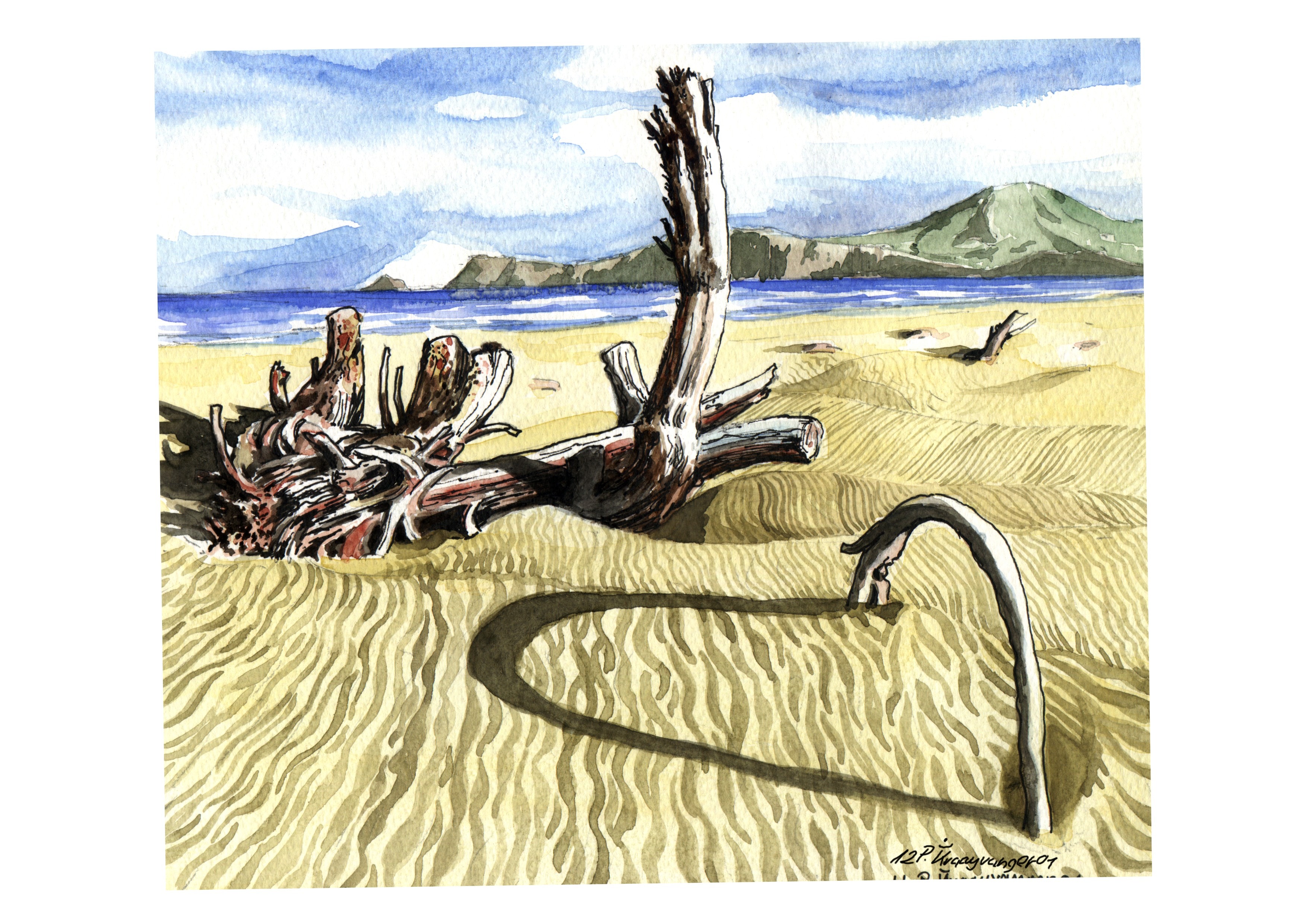 Free image/jpeg, Resolution: 3508x2480, File size: 1.76Mb, watercolour painting beach landscape picture with tags: watercolour, beach, water, bank, wood