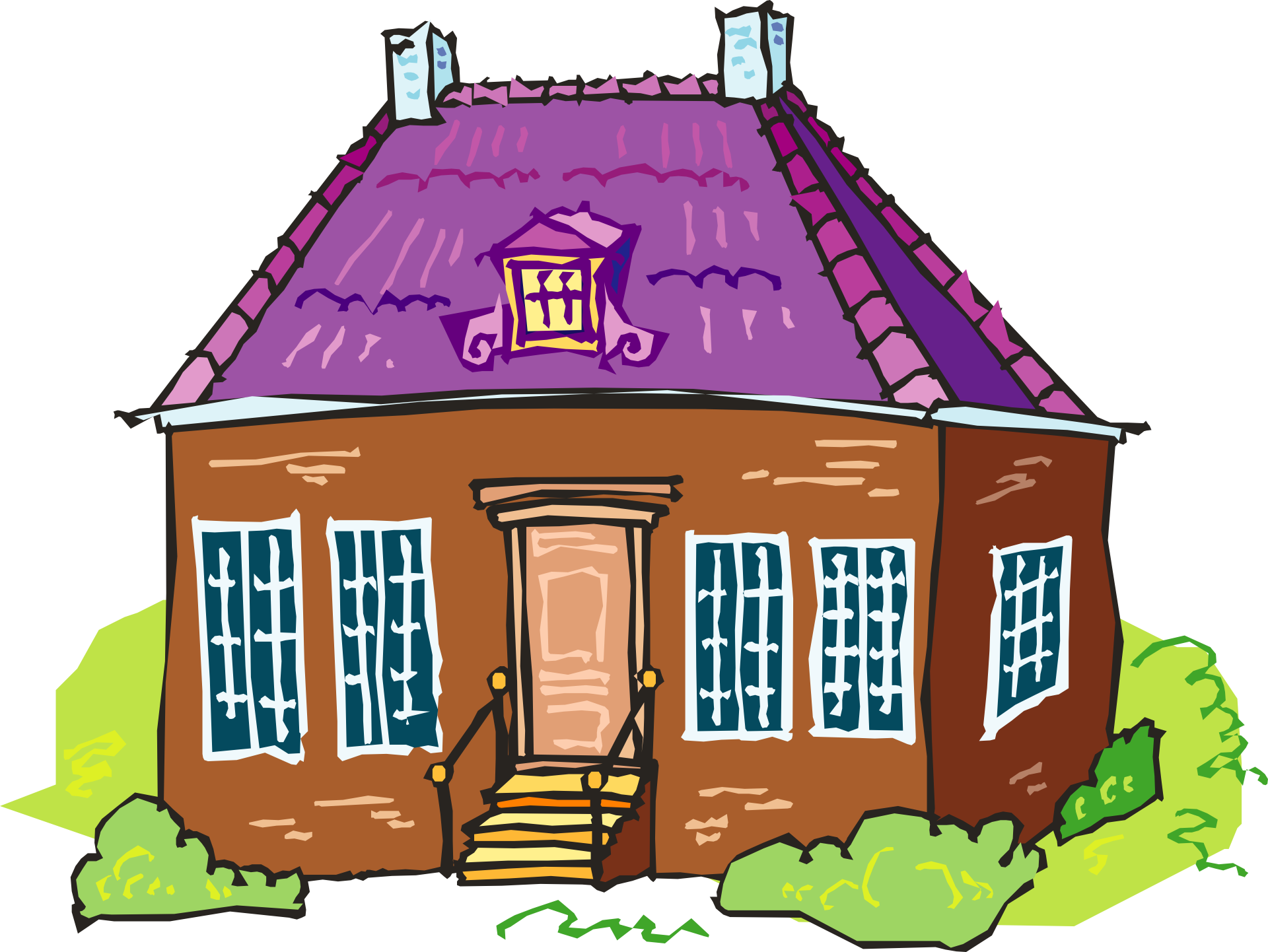 Free image/png, Resolution: 1920x1442, File size: 397Kb, brick house with purple roof picture with tags: house, brick, brown, purple, steps, door, bushes