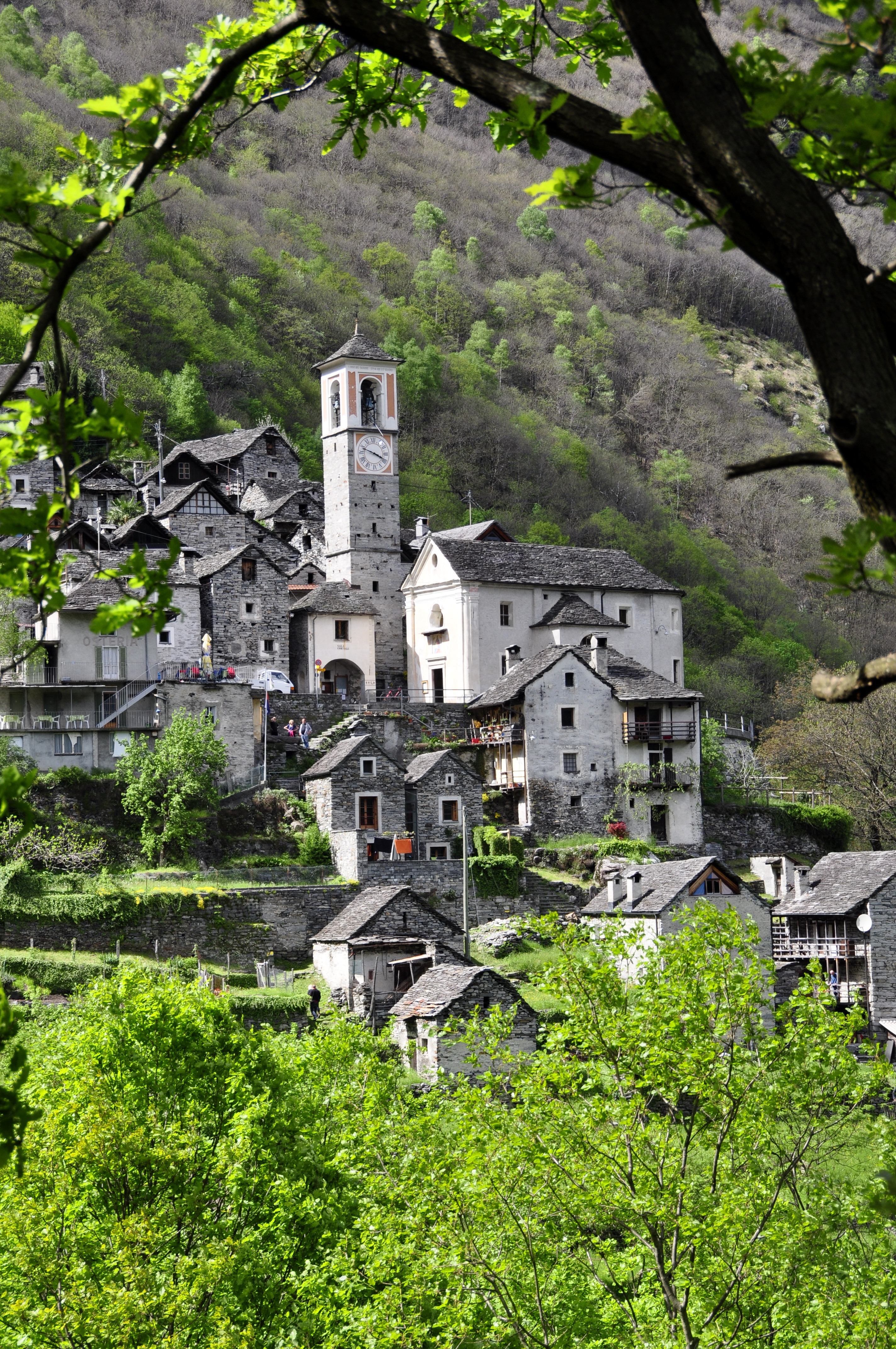 Free image/jpeg, Resolution: 2848x4288, File size: 4.77Mb, grey stone houses and church on mountain side at summer, switzerland, ticino picture with tags: bergdorf, ticino, alpine, stone house, switzerland, building
