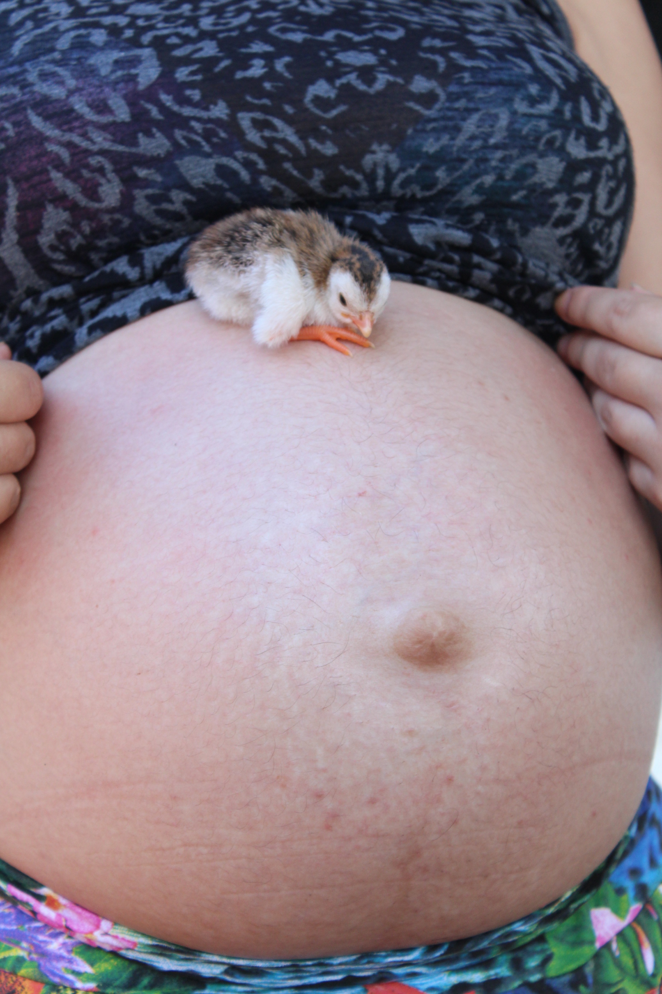 Free image/jpeg, Resolution: 2304x3456, File size: 1Mb, chicken on pregnant woman’s belly picture with tags: gestation, chick, female, stomach, little
