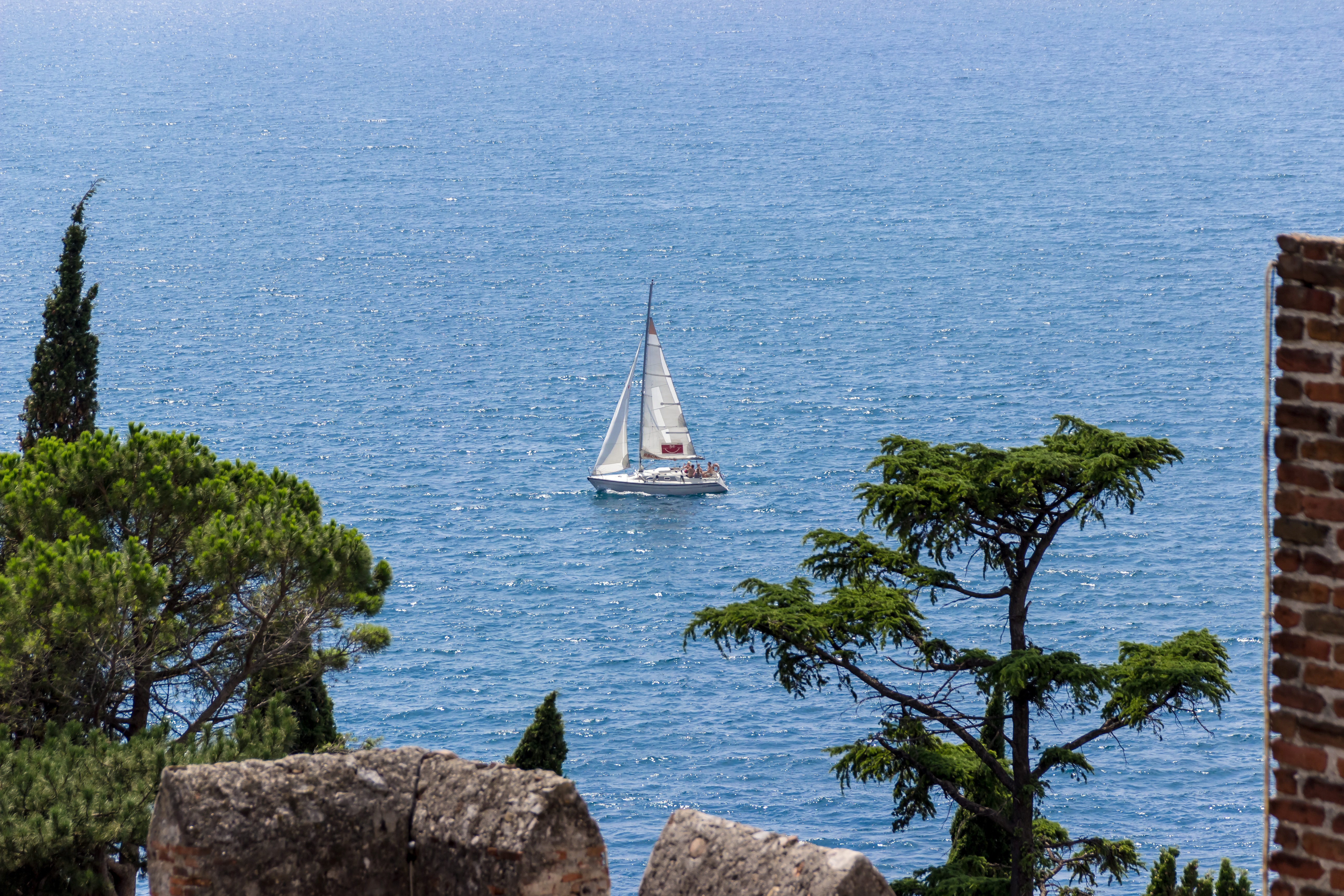 Sailing boat on the water behind rocks and green trees
