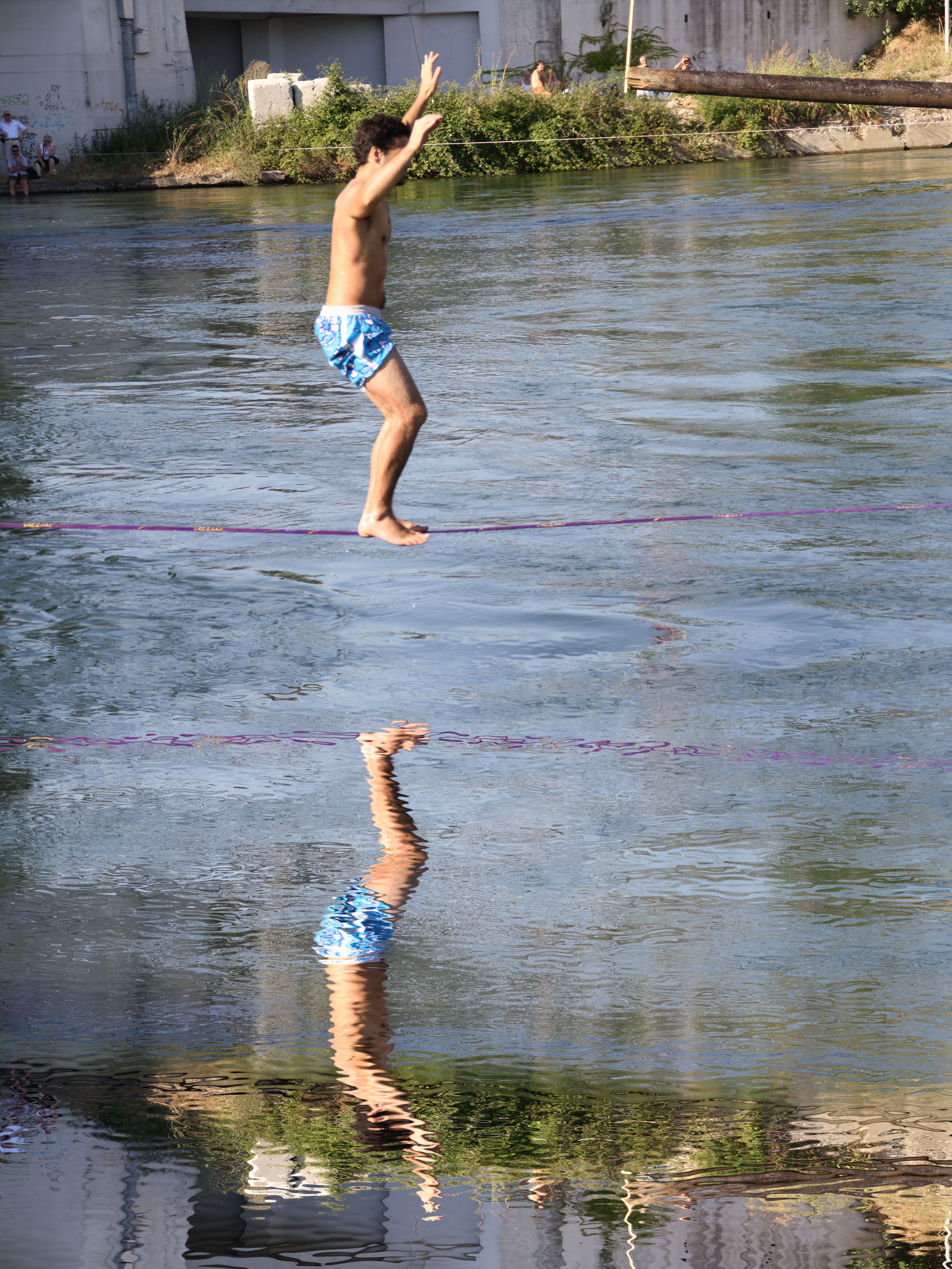 Free image/jpeg, Resolution: 3888x5184, File size: 4.64Mb, guy in shorts jumping into the water picture with tags: equlibrista, naviglio, acrobat, jump, walk line, lake, sport, shorts