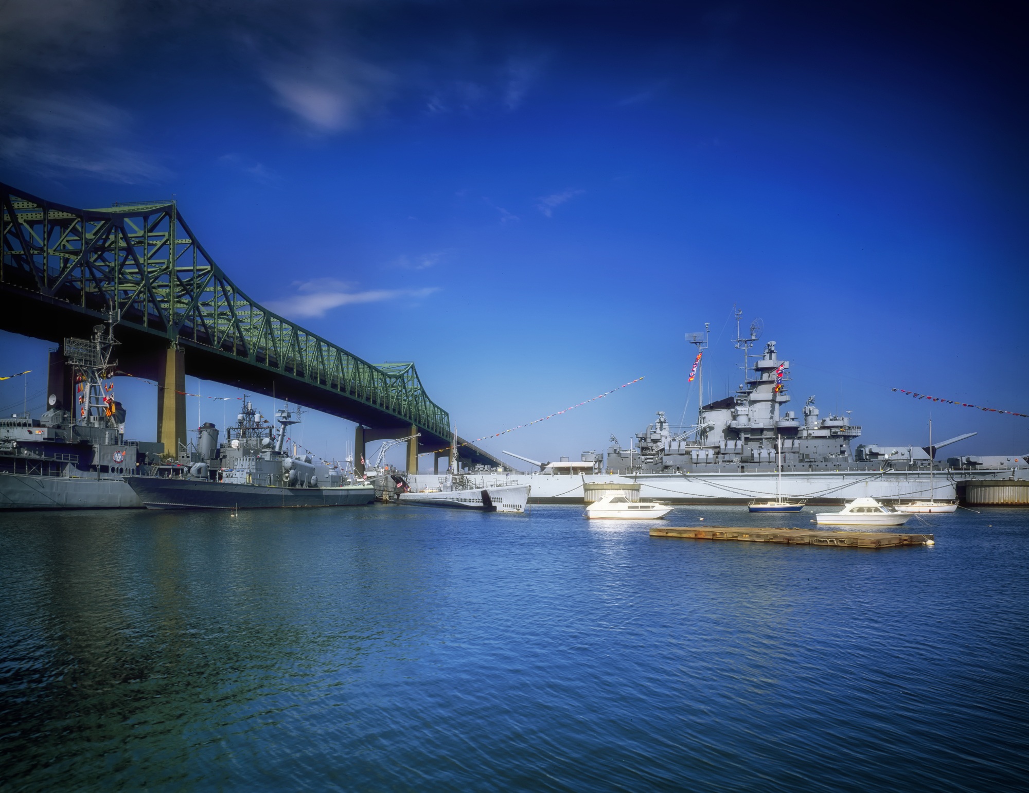 Free image/jpeg, Resolution: 2000x1542, File size: 688Kb, battleships in the bay of massachusetts picture with tags: battleship cove, battleships, fall river, massachusetts, bridge, architecture