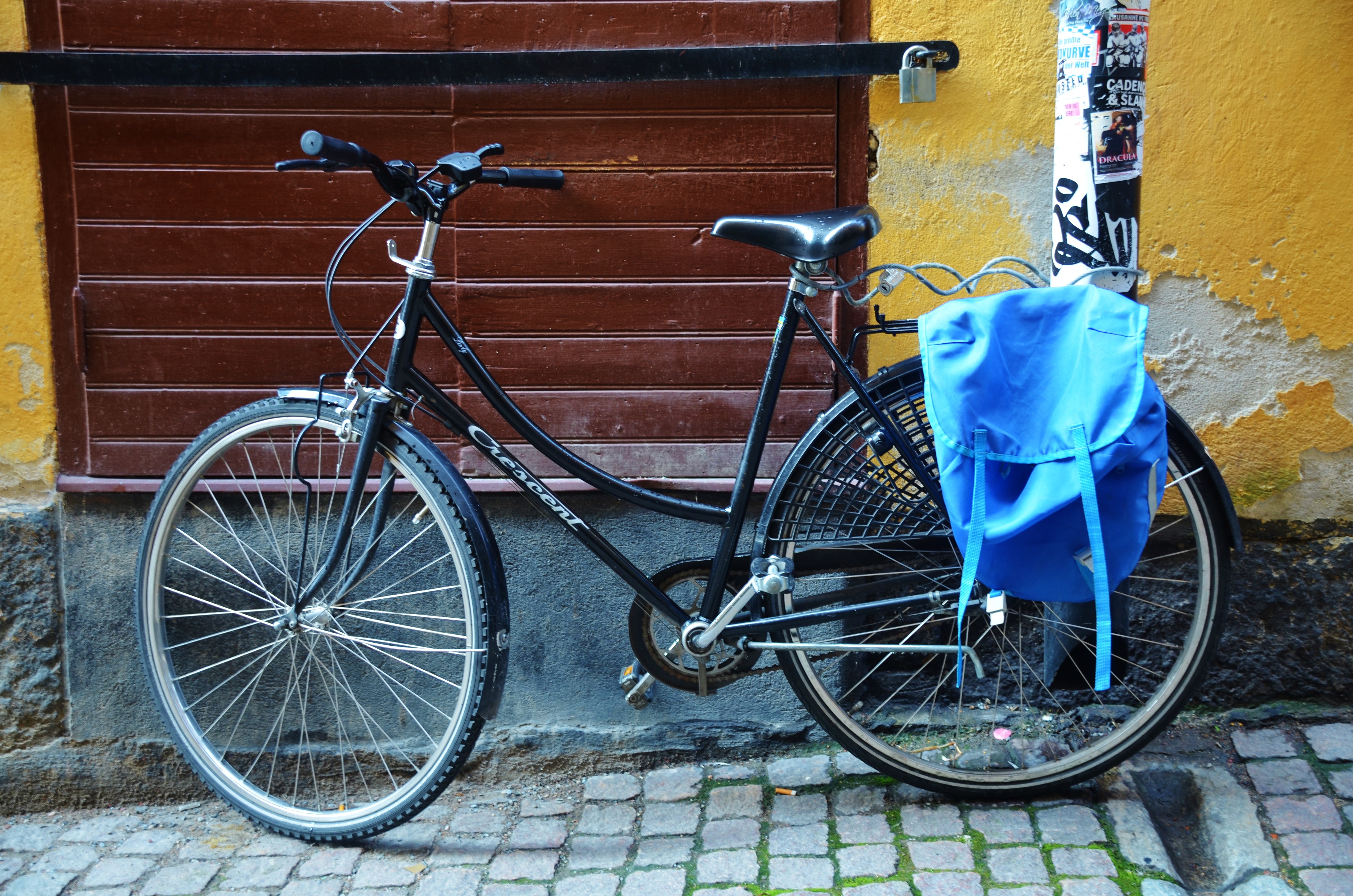 Free image/jpeg, Resolution: 4928x3264, File size: 4Mb, bike and blue backpack picture with tags: bicycle, transport, black, wheel, road