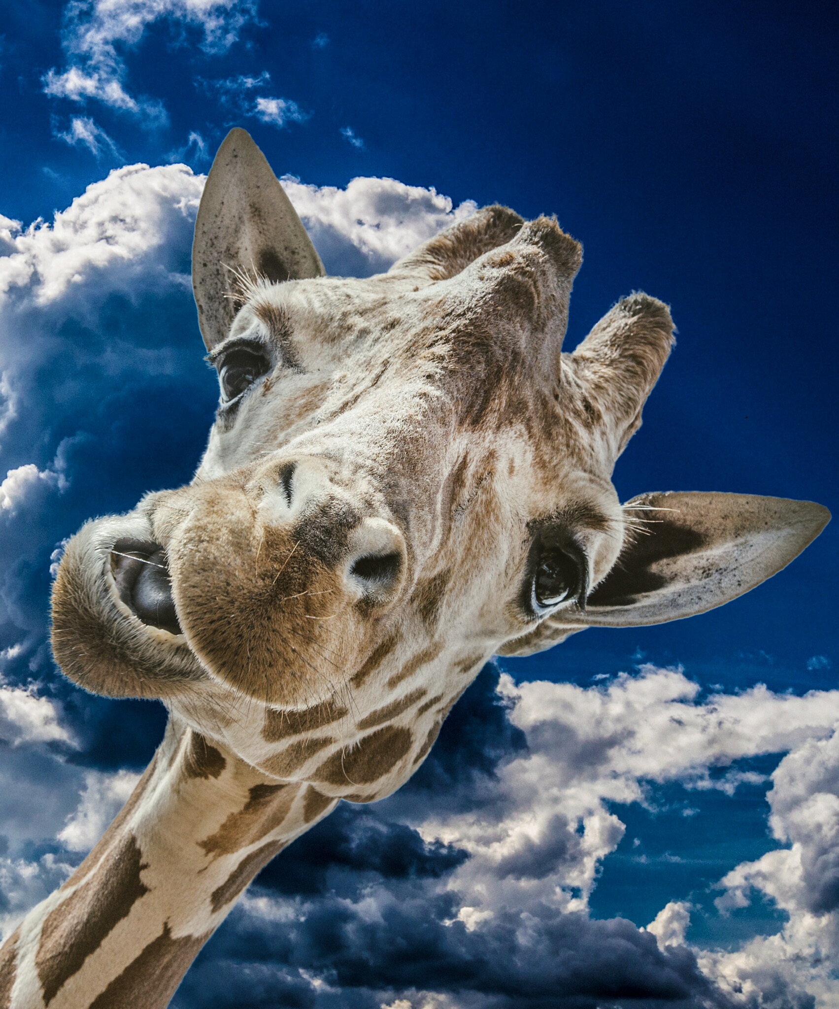 Free image/jpeg, Resolution: 1703x2048, File size: 923Kb, Funny Giraffe head at Clouds picture with tags: giraffe, funny, clouds, wild, animal, head